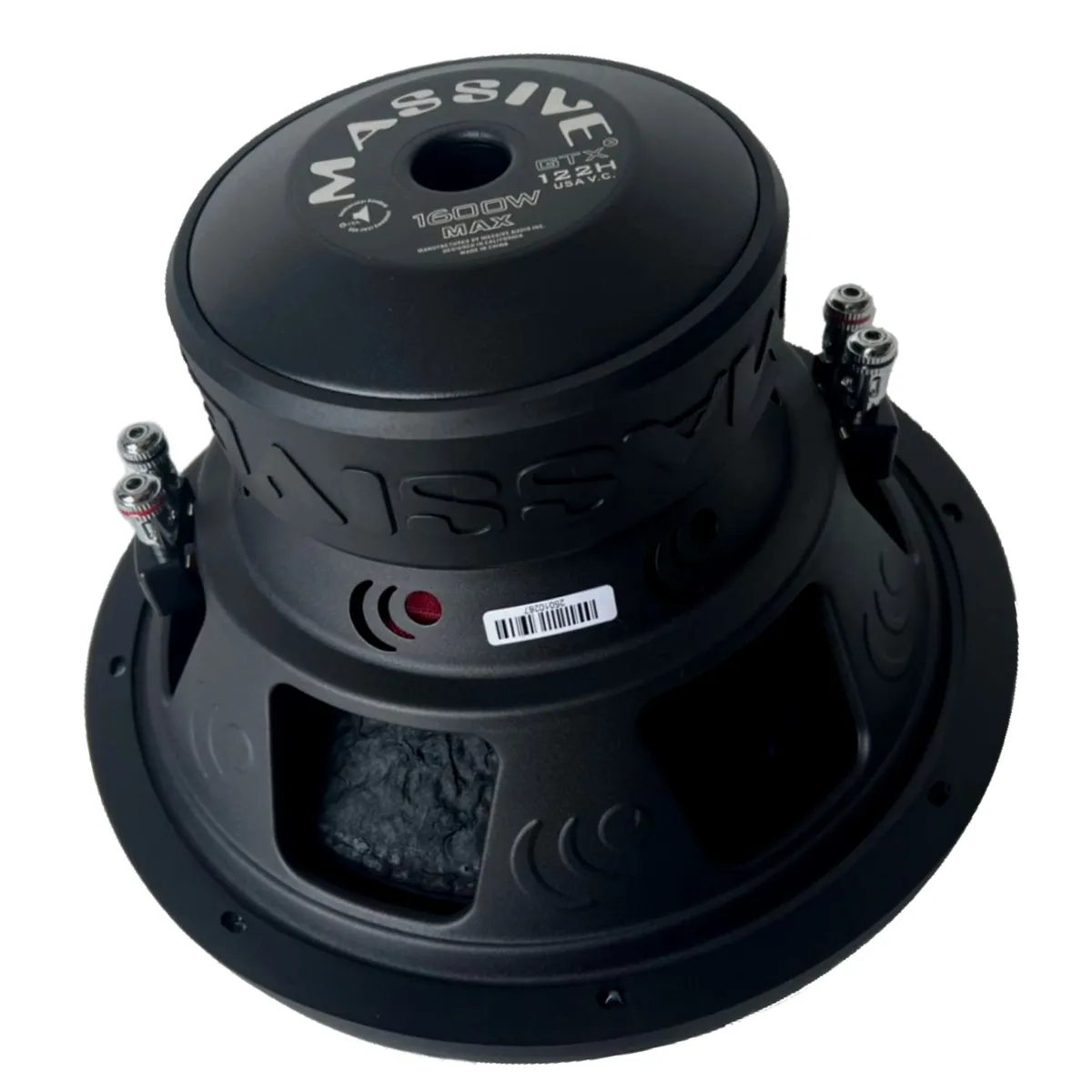 SOLD AS EACH Unleash Deep, Controlled Bass with the GTX122H The Massive Audio GTX122H is a powerhouse 12" subwoofer built for serious sound enthusiasts. Delivering 800 Watts RMS and 1600 Watts MAX, this dual 2-ohm beast features a heavy-gauge steel basket with industrial texture painting for unmatched durability. At its core are dual stacked high-flux Y30 120oz Strontium Ferrite magnets and a 10mm top plate, driving intense magnetic force for clean, thunderous bass. Its UV-treated non-pressed paper cone is stitched with tight red threading and bonded to a pressed foam surround, ensuring long-lasting performance and minimal distortion. The GTX122H’s poly-cotton spider and high-grade woven tinsel leads connect to spring-loaded 5-way nickel-plated terminals, offering reliable signal transfer and flexible installation. With a compact 6.69" mounting depth and a precision-engineered 10.79" cutout diameter, the GTX122H fits a wide range of enclosures while delivering Massive Audio’s signature sound quality. Whether you're upgrading your car audio system or building a custom setup, this subwoofer is designed to perform and built to last. Manuals & Downloads GTX122H Manual FEATURES Heavy gauge Steel Basket with Industrial Texture Painting Dual Stacked High Flux Y30 120oz Strontium Ferrite Magnets Dual Impedance / 2.5" 4 Layer Hi-Temp Copper Voice Coil Poly Cotton Spider with Woven Round Tinsel Leads UV Treated / Non-Pressed Paper Cone with EROM Foam Surround Round Shape PP Vacuum Dust Cap 10mm Top Plate Customized Rubber Gasket & Magnet Boot SPECIFICATIONS Size 12" Watts RMS 600-800 Peak Power 1600 Cone Non-Pressed Paper Voice Coil 2.5" Dual 2 Ohm Surround Pressed Foam Magnet 120oz Terminals 5 Way Binding Push Terminals Basket Heavy Gauge Steel Tinsel Leads Woven Round X-Max 15mm with 10mm Top Plate SPL 86.6 dB FS 36Hz Ported Box 14"H x 18"D x 13.75"W / 12.56 sq. in. Port Area Sealed Box 1.25 ft3 - 14" x 14" x 11.95"