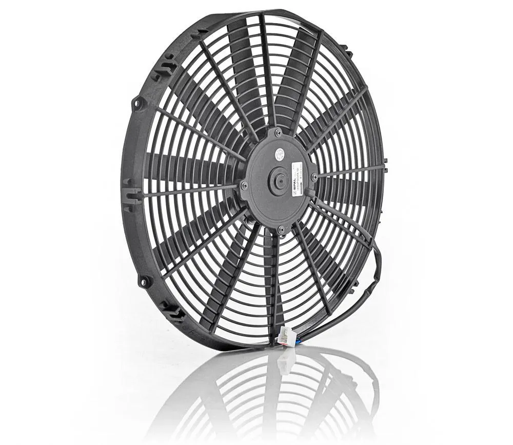 16 Inch Qualifier Series Electric Cooling Fan Fan Motor: Thin Line CFM: 1300 Airflow Direction: Puller Max Current Draw: 7.5 Amps Blade Shape: Straight Fan Blades: Single Blade Diameter: 16 Inch Unit Width: 16 Inch Unit Height: 16 Inch Unit Depth: 2.05 Inch Fan Color: Euro Black Sold Individually SKU: 75058