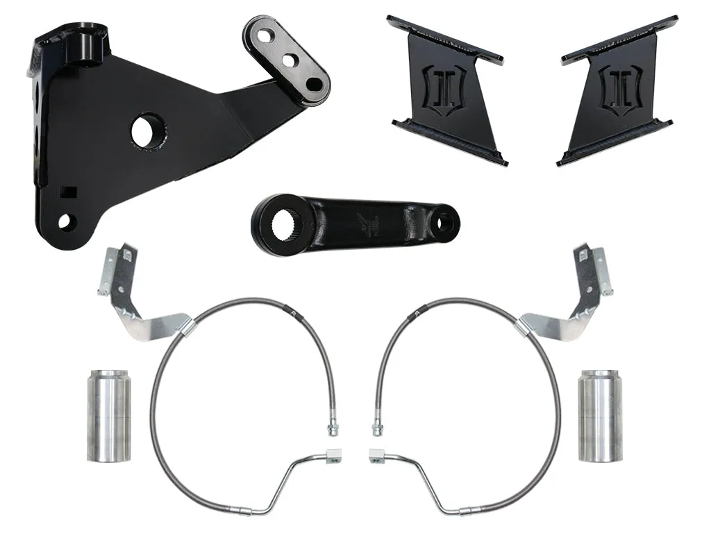 The ICON 2011-2022 Ford F-250/F-350 Super Duty 4WD Front Box Kit is an essential component of ICON 7” lift suspension systems. Front sway bar drop brackets fabricated from CNC laser cut steel plate ensure bind free motion of the sway bar links through the entire range of suspension travel and are powder coated for corrosion resistance. The fabricated track bar drop bracket corrects the track bar geometry for the new, taller lift height and steering geometry is addressed by the forged drop pitman arm. Extended length stainless steel brake line kit prevents brake line damage and eliminates the bending of OE hard lines typically required for brake line drop brackets. Bump travel is properly limited with robust CNC machined 6061 aluminum bump stop spacers that are designed for the stresses of aggressive off-road driving. Wheel with confidence that all of these components are covered by ICON Limited Lifetime Warranty.