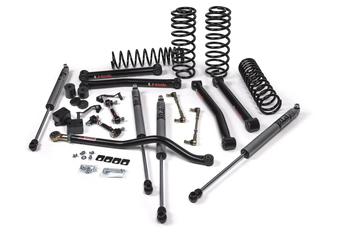 Raise up your Jeep Wrangler JL 4 Door with a J-Konnect 3.5 Inch Lift kit to fit larger tires and increase off road capabilities. The J-Konnect kit includes dual rate coil springs, tuned gas shocks, adjustable front track bar, J-Link lower control arms, and sway bar Quicker Disconnects as well as all other hardware required for a complete 3.5 Inch lift. While the entry level J-Venture systems is designed for equal parts on-road handling and off-road capability, J-Konnect takes strength and performance a step further by adding front and rear fixed length J-Link lower control arms. These lower control arms not only add front caster and rear wheelbase, they are a serious upgrade to the strength over the factory control arms. Built 2 inch x .250-wall DOM tubing while offering better NVH isolation with large factory style rubber bushings at both ends. The end result is aggressive off-road performance and strength while maintaining excellent on-road manners. Get connected with J-Konnect Features & Benefits Fox Adventure Series Shocks Front/Rear Dual Rate Coil Springs (HD) designed to great ride quality across any terrain. HD springs offer additional load capacity for vehicles equipped with winch bumper, fullsize spare, roof rack, etc. Front/Rear Gas Shocks (JPSEC or FOX) specifically valved for this suspension system for improved performance on and off-road. Front Adjustable Track Bar and Rear Track Bar Bracket to correct axle positioning under vehicle. Front Sway Bar Quicker Disconnects and Rear Sway Bar Links for increased offroad articulation. Front/Rear Bump Stop Extensions to properly limit suspension up travel. Front/Rear J-Link Lower Control Arms to add strength and correct caster.
