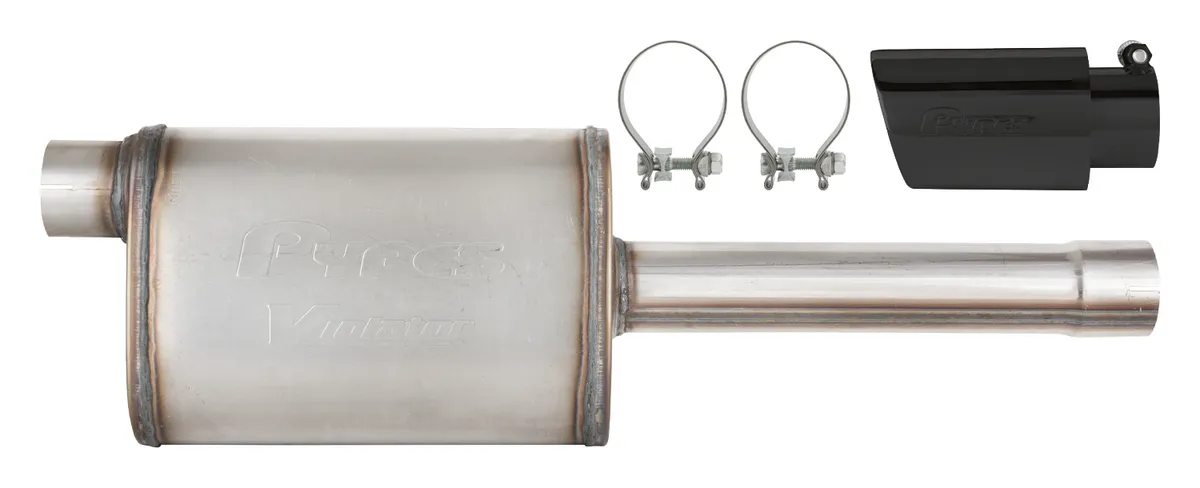 Pypes Violator Tunes and Tip Muffler Replacement Kit SGT32VB Fits 2019-2025 Chevy Silverado and GMC Sierra 1500 4.8L/5.3L (Single Exit) Looking for a quick and affordable way to upgrade the sound and style of your GM truck? The Pypes SGT32VB Violator Tunes and Tip Muffler Replacement Kit delivers bold sound and performance with a sleek, blacked-out look. This kit includes our aggressive-sounding Violator muffler with an attached mid-pipe and clamps for a simple cut-and-clamp installation. Also included is a premium 4 inch diameter x 8 inch long black powder-coated 304 stainless steel tip, giving your truck a stealthy, modern appearance to match the enhanced tone. Built from 409 stainless steel, the system features a 2.75 inch inlet and outlet and is backed by Pypes' limited lifetime warranty. Its free-flowing design improves exhaust velocity, supporting better throttle response, fuel economy, and overall performance without creating excessive cabin drone. Whether you're towing or commuting, this system delivers a deep, aggressive exhaust note and a finished, custom appearanceall at a fraction of the cost of full aftermarket systems.