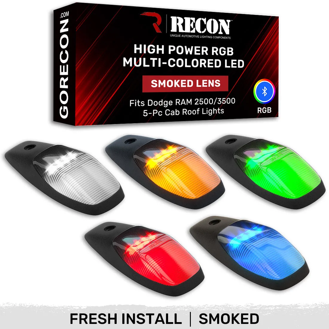 - Multiple Lens ***ATTENTION*** THIS KIT FOR INSTALLATION ON A TRUCK THAT DID NOT COME WITH FACTORY/OEM CAB LIGHTS. IF YOUR TRUCK CAME WITH FACTORY CAB LIGHTS YOU WILL NEED PART # 264346BKRGB . ***DON'T FORGET*** IF YOUR 2019-2025 RAM 2500/3500 DID NOT COME WITH OEM FACTORY CAB ROOF LIGHTS WE RECOMMEND INSTALLATION TEMPLATE PART # 264345T RECON RAM 2500/3500 RGB MULTI-COLORED CAB ROOF LIGHTS Fits 2019-2025 Dodge RAM HD 2500/3500 Truck Available in Smoked Lens or Clear Lens RGB Multi-Color with selectable lighting colors, running lights, strobing patterns & more (via Bluetooth) User Controlled by Bluetooth App for Ease of Use (changing colors, patterns, strobing, brightness) Fresh Installs: For Models That DID NOT Come With Factory/OEM Cab Lights Ultra Bright LED Lights Illuminate in Endless Variety of Colors (User Controlled) Improves the Visibility of Your RAM 2500/3500 Ditch the dull OEM look and make a bold statement that stands out Made using Military-Grade reinforced ABS Plastic Lens Impact Resistant Rugged Durability IP67 Waterproof rating (Dust, Dirt, Water, Snow) UV-Treated to Protect Against Direct Sunlight Exposure Features Advanced LED Running Lights w/ 50,000+ Hour Lifespan SAE and DOT-Compliant Easy Installation Sold as a 5-Piece Set Enhance Your RAM 2500/3500 Truck Upgrade the safety and style of your 2019-2025 Dodge RAM 2500/3500 Truck with the RECON 5-Piece Ultra Bright RGB Multi-Colored LED Cab Roof Light Kit. Designed for RAM 2500/3500 truck models that DID NOT come with factory cab roof lights this high-performance kit enhances visibility in low-light conditions and harsh weather, ensuring you're seen when it matters most. Featuring ultra-bright, high power RGB LEDs, it offers customizable colors, pattern, strobing and brightness adjustments via a Bluetooth app for effortless control. Available in your choice of smoked or clear lens, this kit is built for durability and seamless installation, combining rugged functionality with a bold, modern look. Ultimate Visibility & Durability Engineered for durability, this 5-Piece Ultra Bright RGB LED Cab Roof Light Kit features UV-resistant lenses to prevent fading and an IP67 waterproof rating for all-weather reliability. Impact-resistant, military-grade ABS housing ensures lasting strength, while energy-efficient LEDs deliver a 50,000+ hour lifespan. Built to withstand the toughest conditions. WHAT’S INCLUDED RECON 5-Piece Ultra Bright RGB Multi-Colored LED Cab Roof Light Kit with Bluetooth App For Easy User Control (Fresh Installs: For Models That DID NOT Come With Factory/OEM Cab Lights)