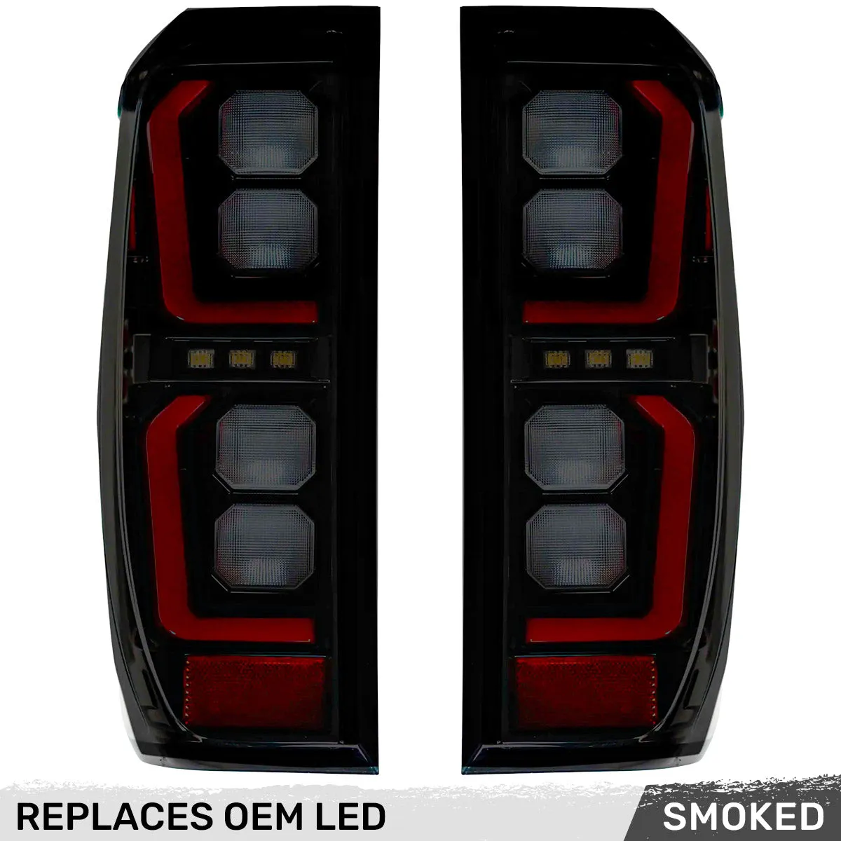 - Multiple Lens ***ATTENTION*** THIS MODEL ONLY REPLACES YOUR FACTORY/OEM LED STYLE TAIL LIGHTS. IF YOUR FACTORY TAIL LIGHTS ARE HALOGEN YOU WILL NEED PART # 264398 SERIES RECON SIERRA 2500/3500 OLED TAIL LIGHTS Fits 2020-2023 GMC Sierra 2500/3500 Smoked & Clear Lens Styles Available Smoked Lens Version (264398LEDBK) includes Startup Light Sequence Replaces Your Factory/OEM LED Style Tail Lights Only Parking Lights: Red Brake Lights: Red Reverse Lights: White Turn Signal: Red Ditch the dull OEM look and make a bold statement that stands out Made using Military-Grade reinforced ABS Plastic Lens Impact Resistant housing for long lasting durability IP67 Waterproof rating (Dust, Dirt, Water, Snow) UV-Treated to Protect Against Direct Sunlight Exposure High Intensity OLED lights w/ 50,000+ Hour Lifespan SAE and DOT-Compliant Easy Installation