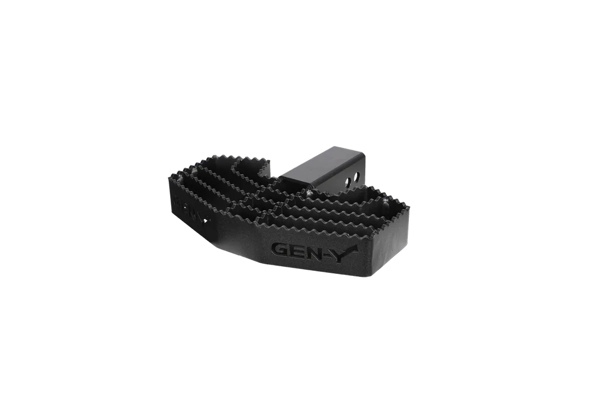 About This Product The Serrated Hitch Step & Boot Scraper is made 100% in the USA and is designed for zero-slip. Our hitch step is engineered and designed specifically so that you can use it as a functional step even when you have a trailer hooked up! We at GEN-Y stand by our products and offer a lifetime guarantee on this hitch step. Furthermore, this product is compatible with all GEN-Y hitches, making it versatile as well as functional. Hitch steps are rated for a 500 lbs. capacity. All GEN-Y products are rigorously tested. Never exceed the recommended capacity on any trailer tow coupling or vehicle receiver hitch.