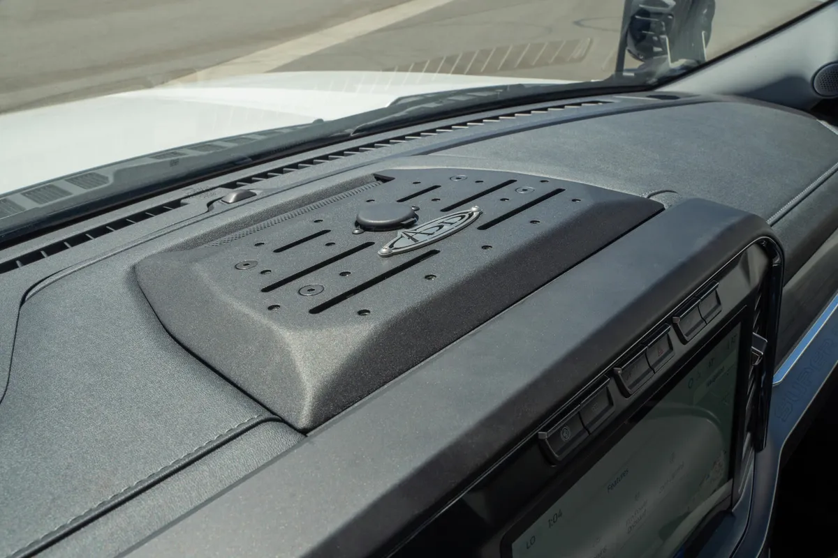 Our Super Duty Digital Device Dash Mount is a perfect solution for mounting your various handheld devices in the cab of your Super Duty. Designed for use with Ram Diamond Base Mounts, Bulletpoint Mounting Solutions, & the Quad Lock Systems/Base Plates , it’s ideal for keeping your smartphone, action cameras, GPS, radio mic, & tablet within arm’s reach. Incorporated in its design are dual 12V USB charging ports bringing you more power for your devices. The mount was thoughtfully engineered to not interfere with the factory in-dash speaker. The contours of the plate matches the styling of the dash for a seamless look, as if it were a factory option. Our dash plate is manufactured from â…›-inch steel and finished in a hammer black powder coat. As always, this is Made in the USA.