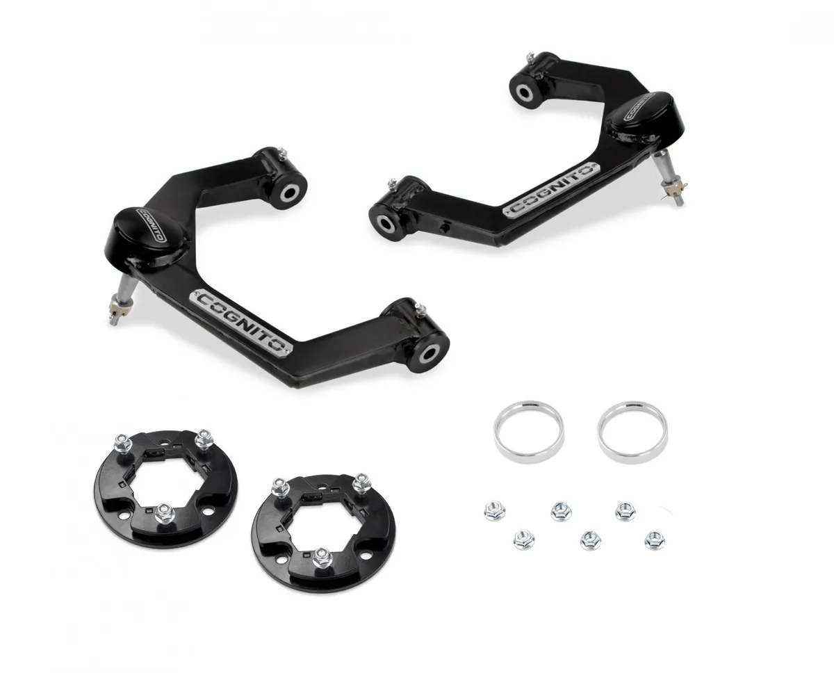Yields 2.5-inches of front lift Cognito Uniball Sm Series Upper Control Arm Kit Control arms include provisions for the Platinum model headlight sensor 1.25 Inch Fk Rod Ends Uni-ball joint with corrected joint angle to handle the required articulation Maintains adequate droop travel to retain ride quality .75-inch strut spacer installs directly onto Oe strut .5-inch preload spacer installs under Oe coil spring Allows up to 35x12.5-inch tire on a 9-inch Wide wheel with a 5.75-inch Backspacing Powder Coated Semi-gloss Black 4-hour Diy install time Made in the USA Applications: Cognito 2.5-Inch Standard Leveling Kit for 2021-2023 Ford F-150 4WD