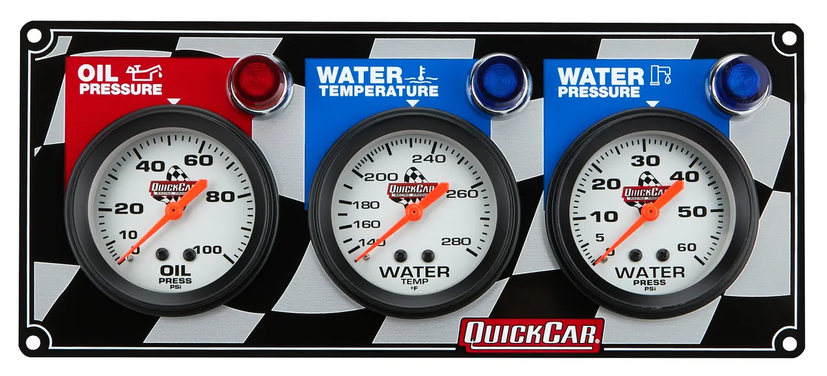Gauge Panel Assembly - Legend Series - Checkered Flag Panel - Oil Pressure / Water Temperature / Water Pressure - 2-5/8 in Diameter - White Face - Warning Light - Kit