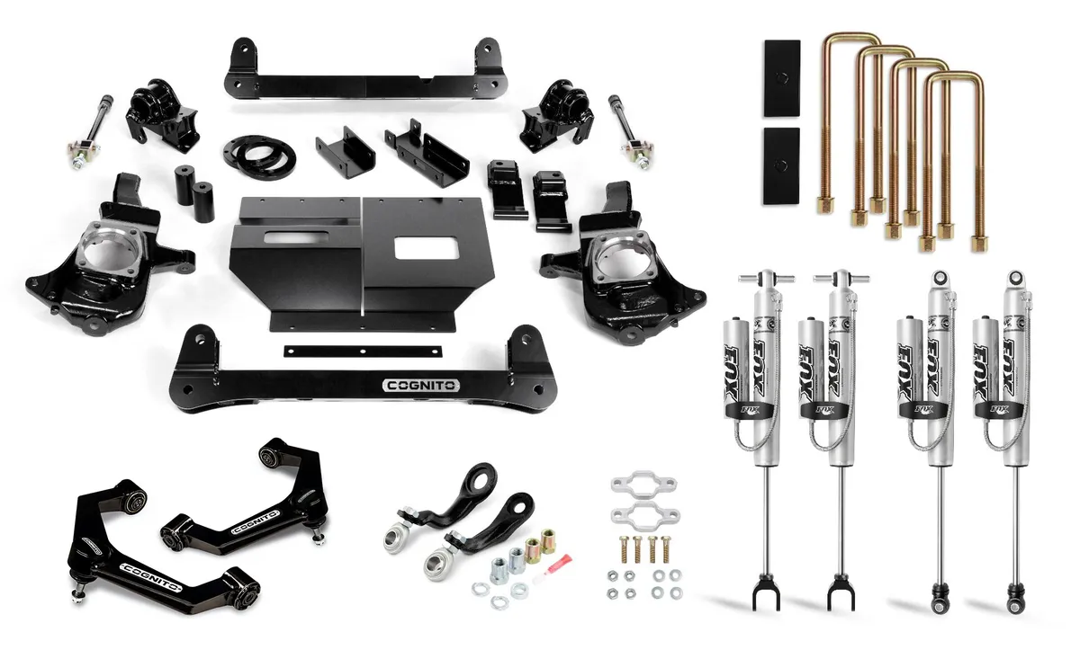 We have bundled everything you need in a lift kit for your Silverado/Sierra 2500/3500 2WD/4WD with high quality Cognito components. There is no guesswork. Cognito components are engineered, manufactured, and assembled in the USA. The Cognito Non-Torsion Bar Drop Front Lift kit is designed and engineered to offer superior ride quality and corrected CV joint angles The Cognito Ball Joint SM Series Upper Control Arms add style, function, and performance to your vehicle by correcting the Ball Joint angle for lifted and leveled applications and improving the allowable droop travel for a better ride quality.The control arm kit features boxed sheet metal arms that are welded and powder coated semi-gloss black. Ball joints are included as well as new crush sleeves and polyurethane bushings. The Cognito Pitman and Idler Arm Support Kit: Pitman and Idler arms have been an inherent wear problem within the steering systems of Chevy and GMC trucks and SUVs for decades. The Cognito PISK (Pitman and Idler Arm Support Kit) replace the problem components that plague factory and aftermarket steering systems on several models and years of GM trucks and SUVs. These improvements are accomplished through application of Cognito's innovative, patented design, by providing additional support to the vehicle's pitman and idler arms, which eliminate the forward and rearward movement of the center-link. The Fox 2.0 Performance Series Remote Reservoir shocks contain the latest in shock technology to transform the performance of your truck. The Fox 2.0 Performance Series front shocks are rust resistant and have a metal impact extruded aluminum body to increase cooling capacity. Eliminates oil aeration allowing maximum performance from the factory-tuned, precision valving. They are easy to install and provide a comfortable on-road ride and predictable off-road handling in even the toughest conditions. The Cognito 1-inch Block and U-Bolt Kit includes 1-inch tall powder coated semi-gloss black cast steel blocks and heavy-duty zinc plated U-bolts Each Kit Features: Yields 4-inches of front lift Cognito Block and U-Bolt Kit yields 1-inch of rear lift SM Series Ball Joint Upper Control Arms Patented Pitman and Idler Arm Support Kit Fox 2.0 Performance Series Remote Reservoir Shocks Maintains Adequate Droop Travel for Superior Ride Quality Levels vehicle front to rear Allows for up to a 35x12.5 Tire on a 9-Inch Wide Wheel 5.75-Inch Backspacing 13-hour DIY install time Made In USA