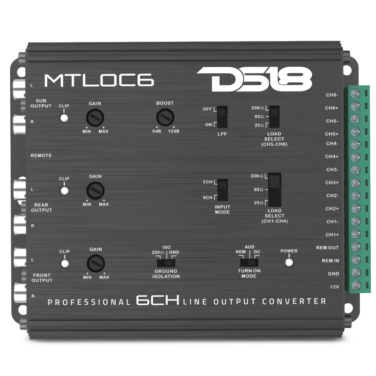 6-Channel High-to-Low Level Line Output Converter with Remote Turn-On DS18’s MTLOC6 converts up to six factory speaker outputs to six RCA low-level signals. Selectable impedance settings and input modes make it compatible with various factory stereo configurations. Automatic Turn-On Features Trigger your amplifier via audio sensing, DC offset, or remote wire for convenience and reliability. Robust Construction A durable anodized aluminum housing with thermal and noise protection guarantees long-lasting performance in any environment. Audio Purity Delivering less than 0.01% distortion across 10Hz–20kHz, the MTLOC6 preserves your music’s detail and power. Bring your system to life with DS18’s MTLOC6.