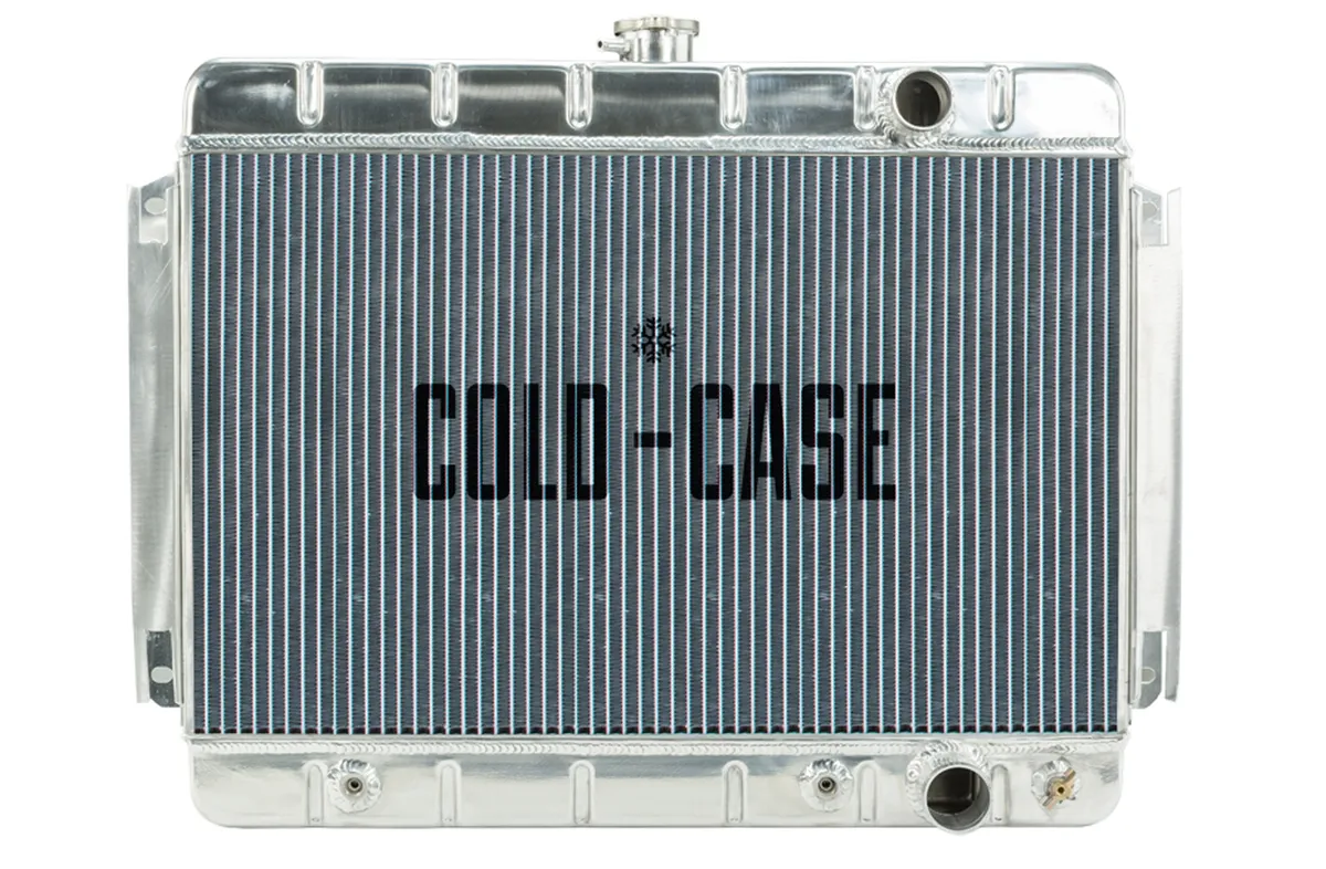 1964-1965 Chevrolet Chevelle/El Camino Aluminum Performance Radiator. AT Transmission. These COLD-CASE radiators are Tig welded 100 percent aluminum and absolutely beautiful. Don't buy a 3 or 4 row aluminum radiator! It doesn't cool as good as these oversize 2 row models. These radiators are original appearing and have the correct stamping. Once painted, you'd be hard pressed to find a difference over an original versus a COLD-CASE. 100 percent TIG welded All Aluminum Polished OE style tanks (2) 1.25 inch Tubes 16 fins per inch Corrugated fins that give more surface area and more thermal transfer Pressure tested For Automatic trans Direct fitment for 64-65 Chevelle/El Camino Old Part Number: RPE541 Radiator Specs Core Height 15.12 inch Core Width 24.72 inch Overall Height 20.125 inch Overall Width 27.75 inch Overall Thickness 3 inch Upper Hose 1.57 inch Lower Hose 1.77 inch Tubes (2) 1.25 inch Tubes