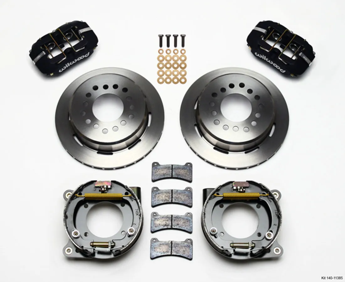 Forged Dynapro Low-Profile Pro-Series rear disc brake kits provide a complete solution for popular muscle car rear axles on applications that require a parking brake assembly and extra clearance for 14.00” to 15.00” rim applications. Forged billet Dynapro Low-Profile four-piston calipers 11.00” one-piece hat and rotor assemblies, and high friction pads provide optimized and balanced braking for all types of custom performance street/strip and show machines. The neatly hidden internal shoe system provides a clean installation with superior static holding power for parking. Optional caliper finishes and rotor designs enable the builder to personalize the style and optimize brake performance for every individual application.