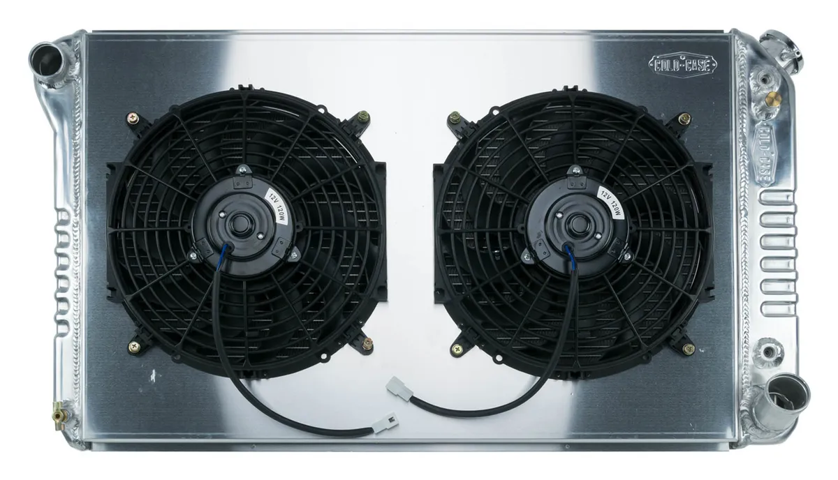 1967-1976 Chevy/GMC Truck Aluminum Performance Radiator and 14 Inch fan kit. For use with 4 core mounting brackets and insulators. Or you can modify 3 core version. When you need the biggest and best, look no further than the Cold Case Super Duty Line. All Super Duty kits include 2 row radiators with 1.25 Inch tubes, aluminum fan shroud and dual 14 Inch fans, flowing at 2200cfm per fan! For extreme horsepower applications OR if you just want the best of the best... These COLD-CASE radiators are Tig welded 100 percent aluminum and absolutely beautiful. Don't buy a 3 or 4 row aluminum radiator! It doesn't cool as good as these oversize 2 row models. These radiators are original appearing and have the correct stamping. Once painted, you'd be hard pressed to find a difference over an original versus a COLD-CASE. 100 percent TIG welded Fan Diameter 12 Inch All Aluminum (2) 1.25 inch Tubes Polished OE style tanks 16 fins per inch Corrugated fins that give more surface area and more thermal transfer Pressure tested For automatic trans Direct fitment for 67-72 GM Truck Old Part Number: RPE558ATFK Radiator Specs Core Height 17.25 inch Core Width 28.35 inch Overall Height 18.6 inch Overall Width 34 inch Overall Thickness 3 inch Tubes (2) 1.25 inch Tubes Upper Hose 1.50 inch Lower Hose 1.77 inch Trans Cooler Fitting: 5/16 Inch Inverted Flare