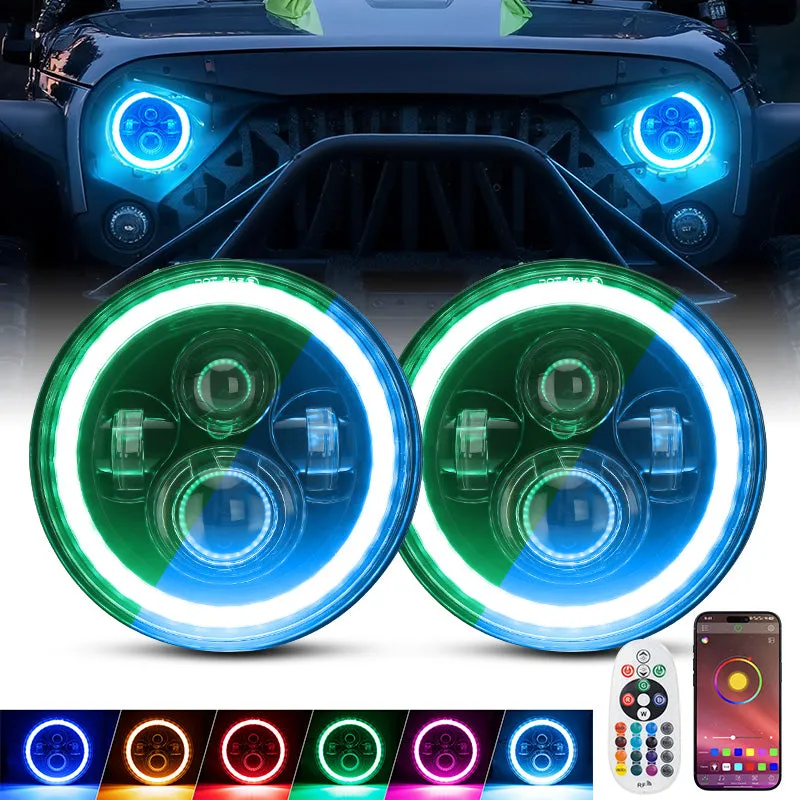 "7"" Jeep Wrangler LED Headlights with RGB Halo App Or Remote Control for 1997-2018"