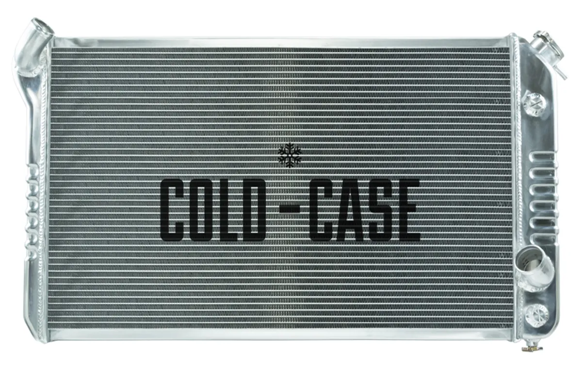 1973-1976 Chevrolet Corvette C3 Aluminum Performance Radiator. These COLD-CASE radiators are Tig welded 100 percent aluminum and absolutely beautiful. Don't buy a 3 or 4 row aluminum radiator! It doesn't cool as good as these oversize 2 row models. These radiators are original appearing and have the correct stamping. Once painted, you'd be hard pressed to find a difference over an original versus a COLD-CASE. 100 percent TIG welded All Aluminum Polished OE style tanks 16 fins per inch Corrugated fins that give more surface area and more thermal transfer Pressure tested Direct fitment for 73-76 Corvette Old Part Number: RPE716 Radiator Specs Core Height 16.8 inch Core Width 27.5 inch Overall Height 19 inch Overall Width 33.7 inch Overall Thickness 3 inch Tubes (2) 1 inch Tubes Upper Hose 1.50 inch Lower Hose 1.77 inch