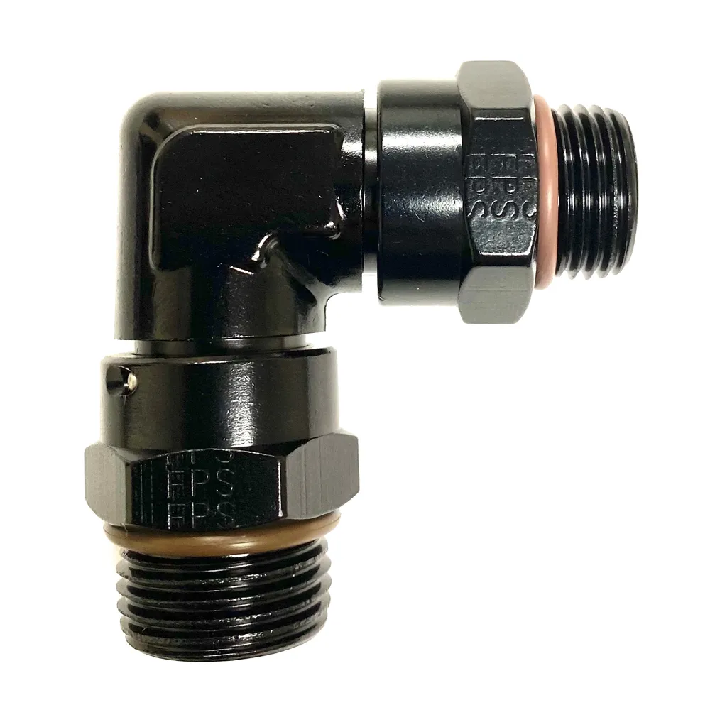 - Adapter - 90 Degree - 6 AN Male O-Ring Swivel to 8 AN Male O-Ring Swivel