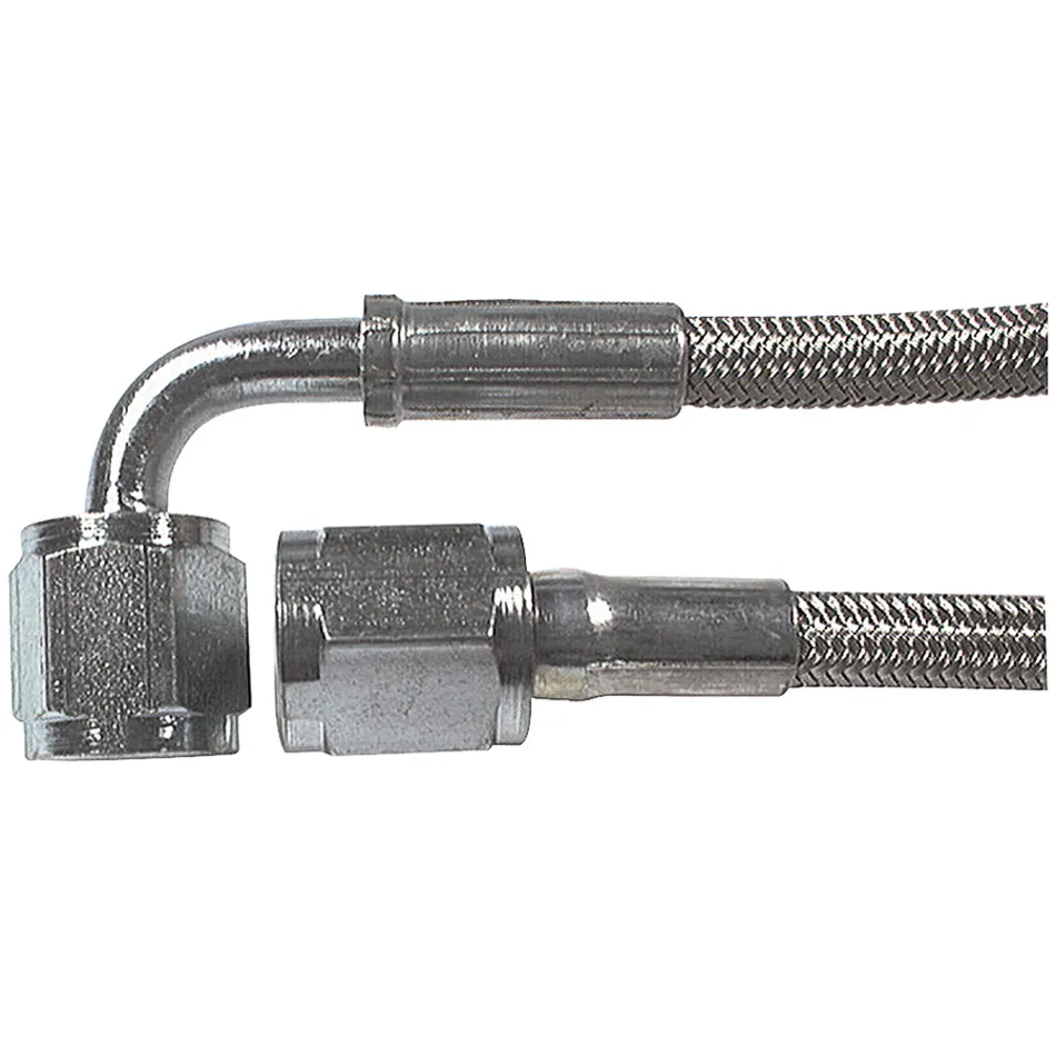 AN Hose Assembly - 9 in Long - 3 AN Hose - 4 AN Straight Female to 4 AN 90 Degree Female - Braided Stainless - PTFE Lined - Each