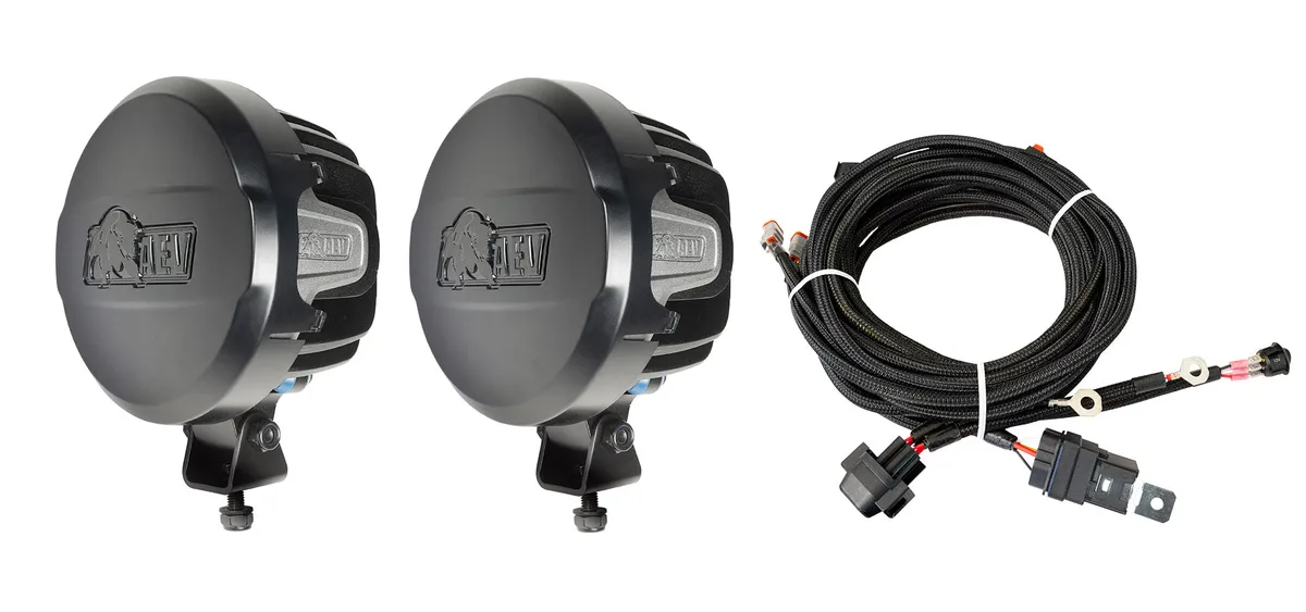 AEV's 7000 Series LED Off-Road Light Kit utilizes the very latest in high-performance LED lighting technology to provide an amazing 8,000 eLumen (effective lumen) output. Designed with the overland traveler in mind, these 7" lights feature a hybrid beam pattern to safely illuminate the road ahead as well as the shoulder - something that is particularly important when traveling through remote areas with active wildlife. The 7000 Series LED Light uses a robust cast aluminum housing with exclusive vibration reducing mounting brackets for lasting durability in any environment and on any terrain. Additionally, these lights feature an IP69K rating, which is the highest rating possible for protecting against water and dust intrusion. Each universal light kit is sold complete with a pair of 7000 series lights, universal mounting brackets, weatherproof wiring harness, and solid light covers featuring the AEV Bison logo. Universal Light Kit Includes (2) AEV logo solid light covers (2) Universal light brackets (2) 7000 series LED lights (1) Universal wiring harness AEV 7000 Series LED Off-Road Light Kit Features Cast aluminum housing and bezel Specialized Lexan 123R lens Shock tested for maximum durability IP69K rating Vibration isolating bracket Tested for EMC interference - meets CISPR 25 Edition 3 Integrated thermal and voltage protection Universal mounting brackets Universal wiring harness w/ switch, weatherproof relay and weatherproof fuse holder Deutsch DT06-2S connectors 5-year warranty on electrical components Lifetime warranty on housing Assembled in the USA