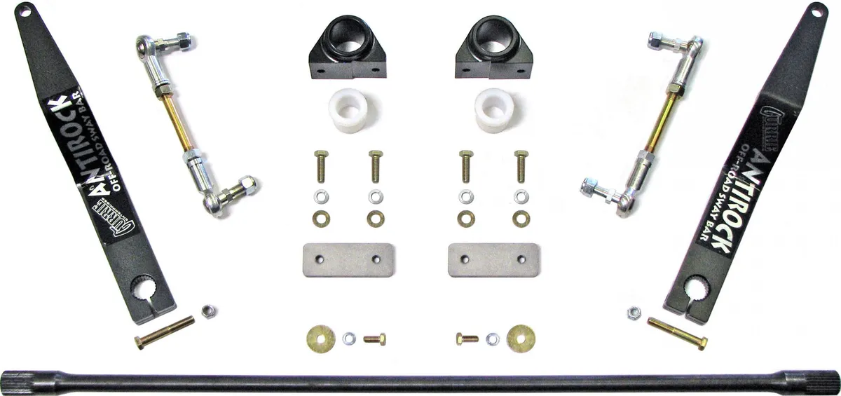 RockJock's Antirock front sway bar kit for 1987-2001 Jeep XJ Cherokees and 1986-1992 Jeep MJ Comanches provides balanced performance of front and rear suspension for rugged off-road conditions. It gives the driver increased traction by balancing and distributing the weight and traction over all four tires. The Antirock off road sway bar is designed to directly replace the stock Jeep sway bar. This bar is made of SAE 4130 heat treated steel for ultimate strength, which is the same quality used in professional off-road competition sway bars. This kit includes all components for installation including, the sway bar, forged chomoly arms, billet aluminum sway bar mounting brackets, bushings, hardware, and step-by-step instructions. The billet aluminum sway bar mounting brackets bolt into the factory sway bar mounting holes under the front frame rails and the sway bar links attach to the stock mounts on the differential housing. The RockJock Antirock sway bar does Not need to be disconnected for off-road use.