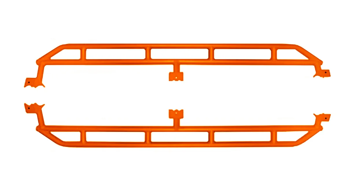 "Jeep Gladiator JT Armor 2019 to Present Rock Sliders Fluorescent Orange Looking for performance on and off the trail? We've got you covered. Whether you call them rock sliders, rock rails, nerf bars or rocker protectors, there are a few features you need to have. The first is obviously protection. ACE Rock Sliders for the Jeep Gladiator are made with beefy 2 inch mild steel tubing, with a super-strong 0.134 thickness. That's some serious protection for your rocker panels. For the ultimate protection for extreme off-roading we recommend pairing them with factory Rubi-Rails, however they do work great by themselves as well. The next big thing is function. ACE Rock Sliders for the Jeep Gladiator shine here as well. Designed with just the right angle to protect up into the side of the rocker panel, ACE Sliders wont get you hung-up when the trail gets dicey. Plus they work great as a step into your Jeep, hanging off the body just enough to get a good foothold. Easy installation? Check. Our rock rails are designed to attach to your existing body mount brackets.
