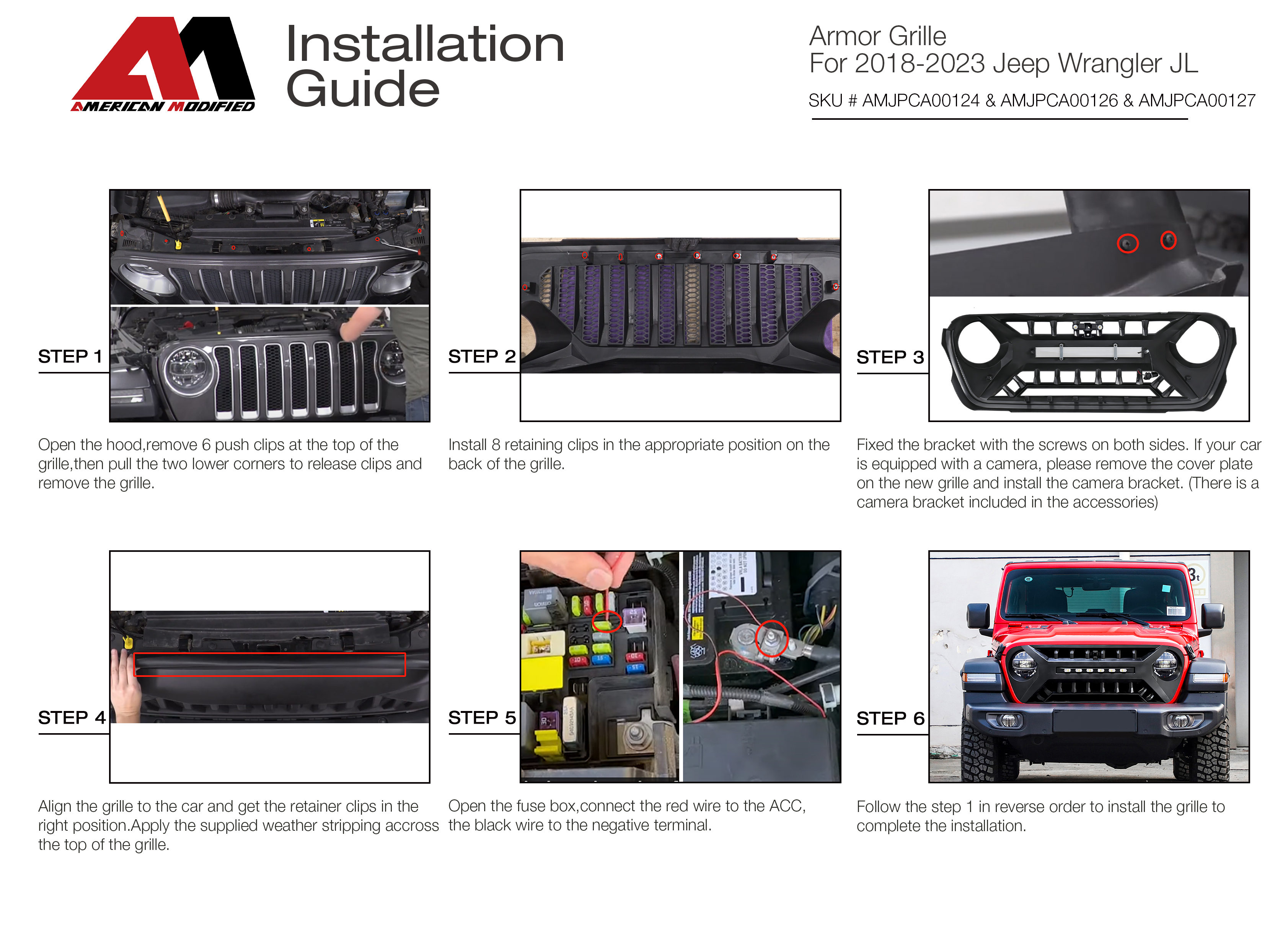 Product Specification Part# AMJPCA00127 Package Dimensions: 52.17*18.9*6.3 inch Package Weight: 12.35 Ibs Features Give Your Wrangler A New Wild Look Off-Road Lights Aggressive Off-Road Styling White & Black Finish Durable ABS Plastic Construction Simple Installation, C amera Bracket Included Fits All 2018+ Jeep Wrangler JL & Gladiator JT Models ( Compatible With JL And JT That Have Cameras ) Descriptions Give Your Wrangler A New Wild Look: Compatible with 2018+ Jeep Wrangler JL & Gladiator JT, replacing your old style grill with the awesome Armor grill inspired by angry eyes design, your off-road vehicle will become the center of attraction and attention while you drive it on the road.