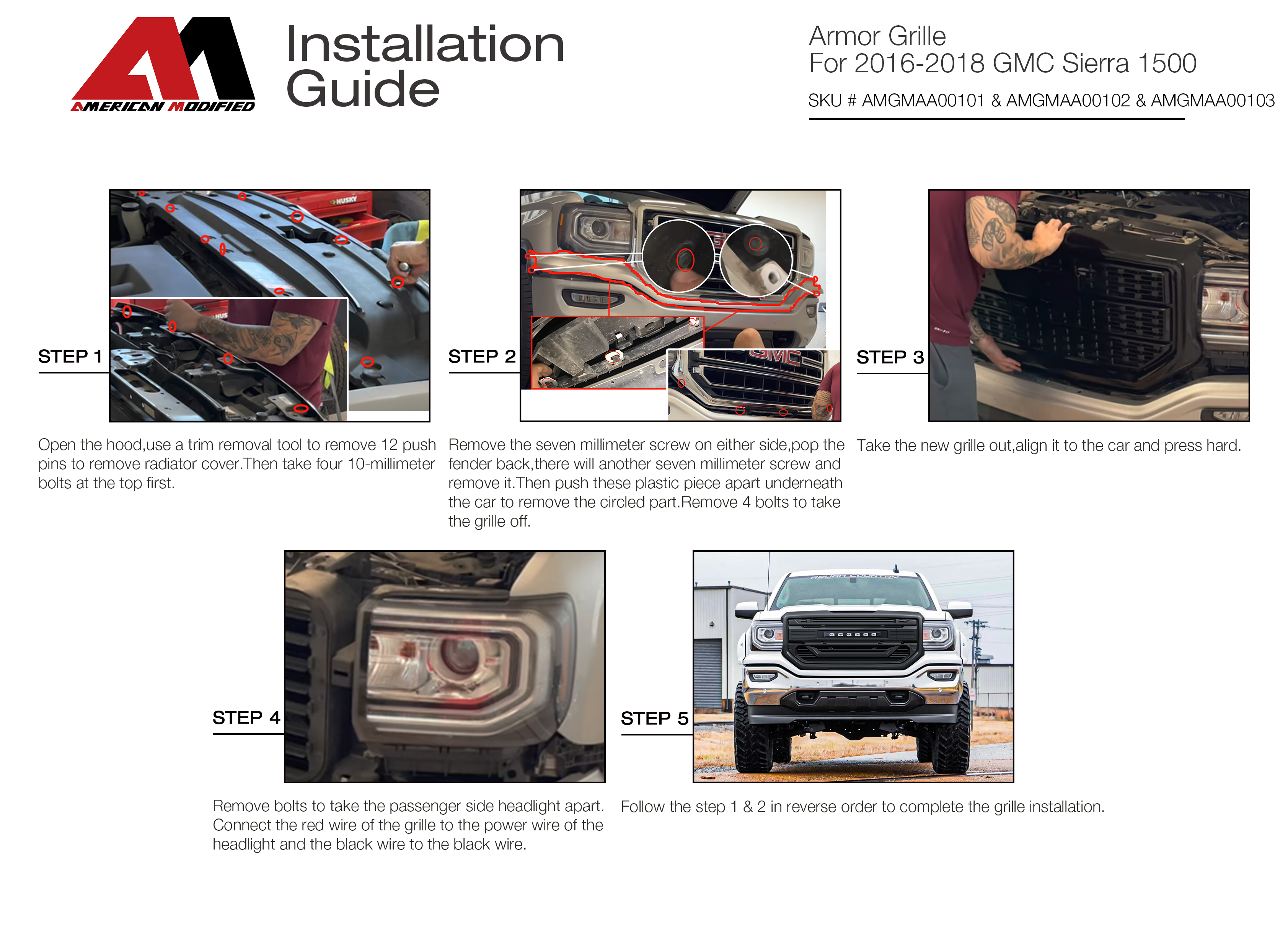 Product Specification Part# AMGMAA00102 Package Dimensions: 51.18*23.62*7.48 inch Package Weight: 19.73 Ibs Features Mean, Aggressive Styling Patented American Modified Design Super Bright LED Light Bar Made Of High Quality Light Weight ABS Plastic With Glossy Black Finish All Necessary Wirings, Brackets And Hardware Are Included Easy To Install, No Modification Needed Fit 2016-2018 GMC Sierra 1500 SLT/ Base/ SLE/ Denali Descriptions Mean, Aggressive Styling: Featuring a mean, angry expression, this AMERICAN MODIFIED Armor Grille will give your truck a more aggressive appearance. So, if you're looking for a way to set your truck apart from the rest, this AMERICAN MODIFIED Armor Grille is for you.