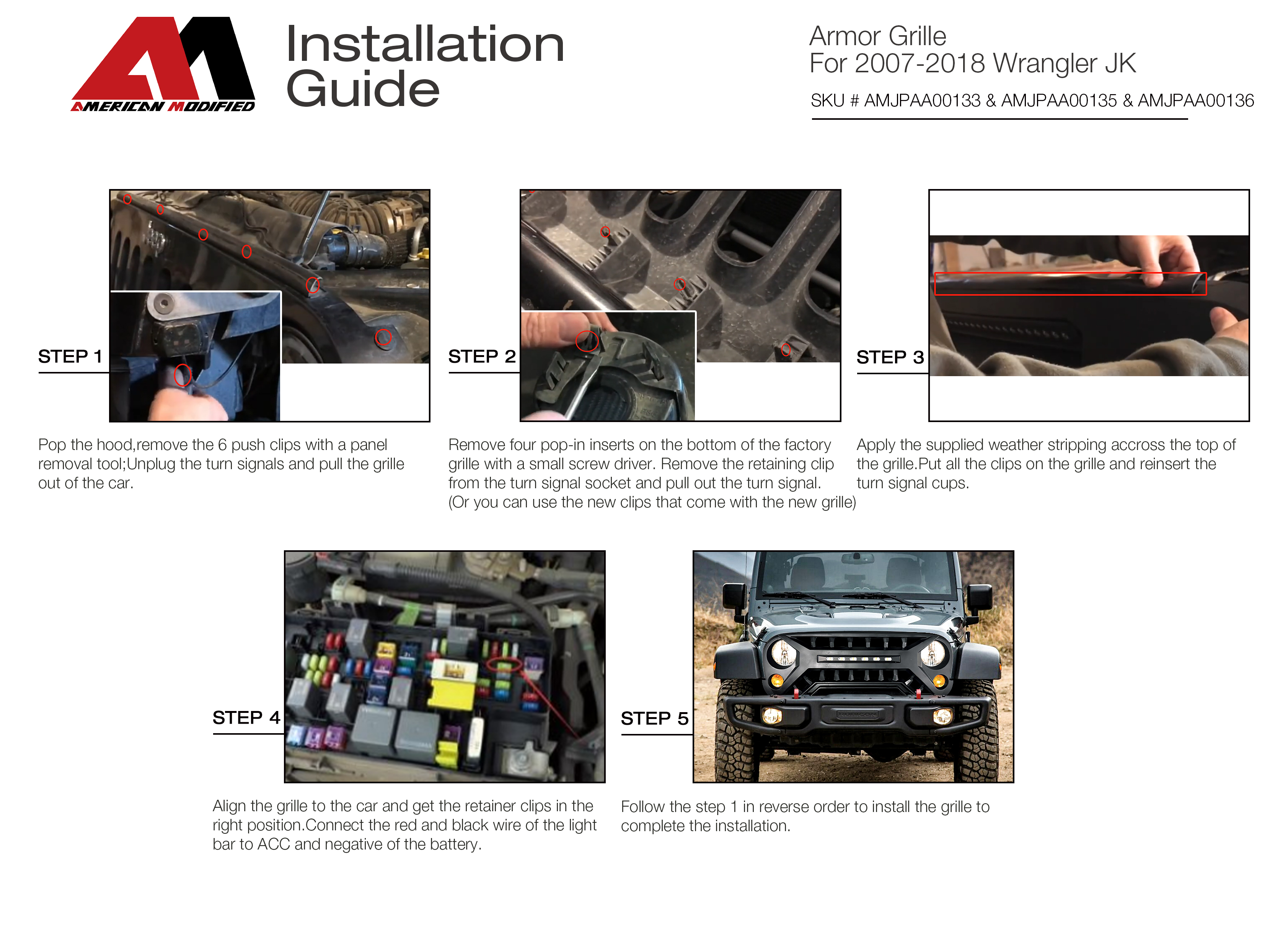 Product Specification Part# AMJPAA00135 Package Dimensions: 50*18.9*5.91 inch Package Weight: 11.57 Ibs Features American Modified Unique Design With US Design Patent Aggressive Off-Road Styling Glossy Black Finish Durable ABS Plastic Construction Simple Installation Fits All 2007-2018 Wrangler JK Models Descriptions Unique Grille Upgrade: If you want a unique look and well-constructed front grille for your Jeep Wrangler JK, the AM Off-Road Armor Grille in matte black is a perfect choice. It's simple to install and instantly upgrades the look of your Jeep, thanks to its unique design.