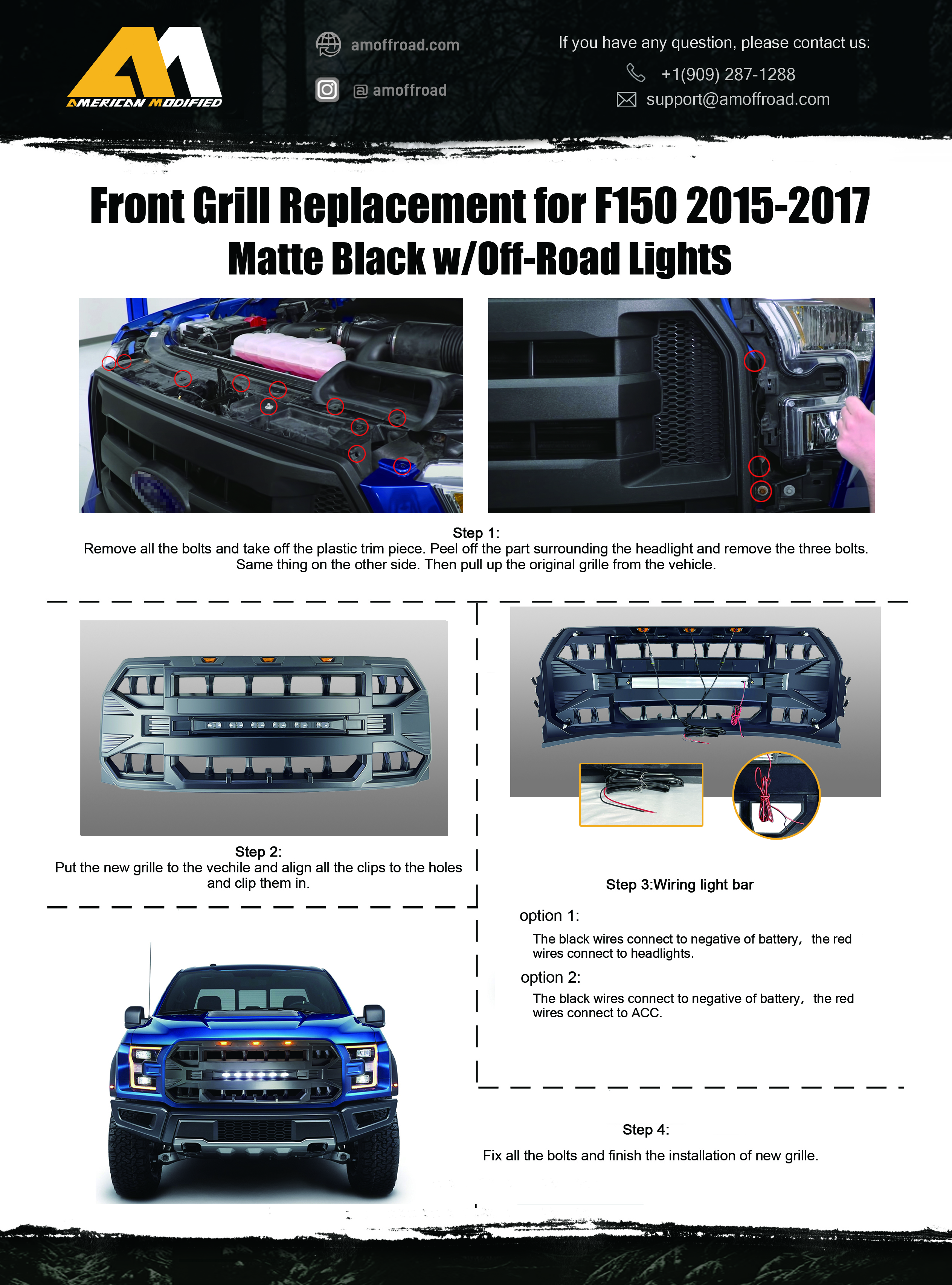 With LED Off-Road Lights help go over any off-roading trail. If you want an unique look and well-constructed grille for your FORD F150, the matte black AMERICAN MODIFIED Armor grille with LED off-road lights is a perfect choice.The eye-catching LEDs not only look great, but will also improve your F150's visibility at night and in poor weather conditions.
