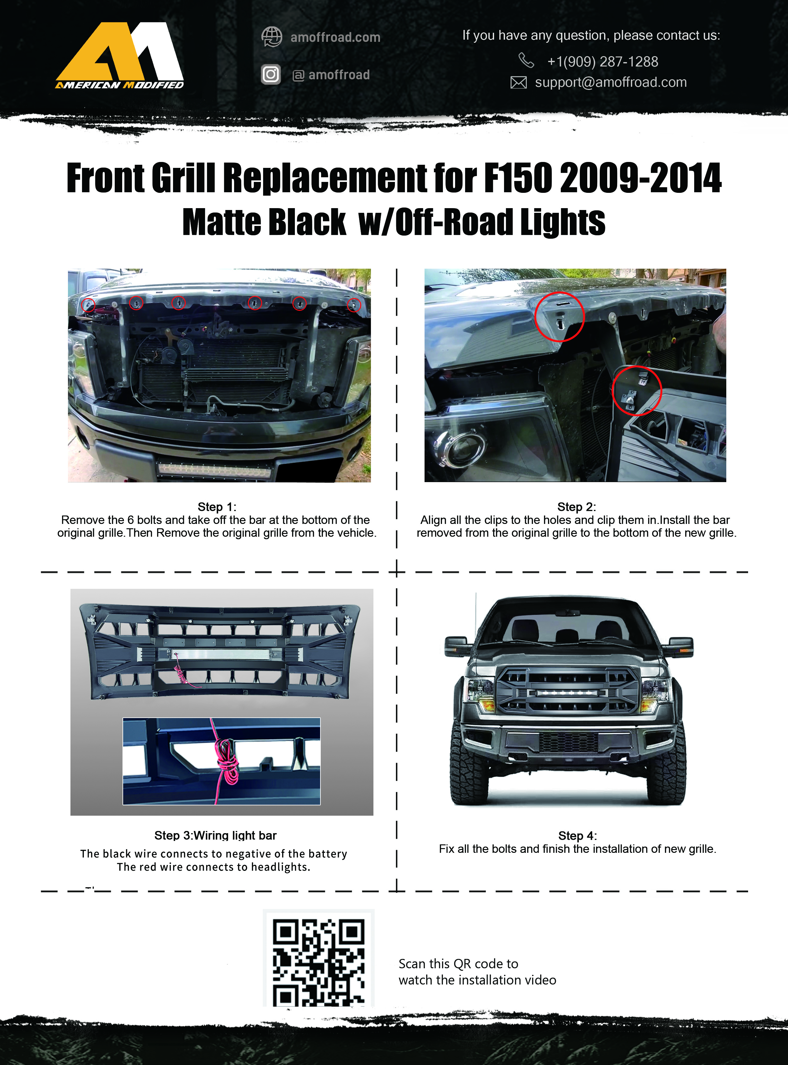 Video Product Specification Part# AMFMAA00114 ( Matte Black ) # AMFMAA00129 ( Glossy Black ) Package Dimensions: 50*20.67*8.46 inch Package Weight: 12.13 Ibs Features U nique, Mean, Aggressive Styling Stylish AMERICAN MODIFIED Design Super Bright LED Light Bar Made Of Light Weight & Top-Grade Durable ABS Material Paintable, Black Primed Finish ( Excluding Letters ) Direct Fit Replacement Grille Simple Straight Forward Installation Fitment: 2009-2014 Ford F150 ( Excluding Raptor ) Descriptions Mean, Aggressive Styling: Featuring a mean, angry expression, this AMERICAN MODIFIED Armor Grille will give your F150 a more aggressive appearance. So, if you're looking for a way to set your F150 apart from the rest, this AMERICAN MODIFIED Armor Grille is for you.