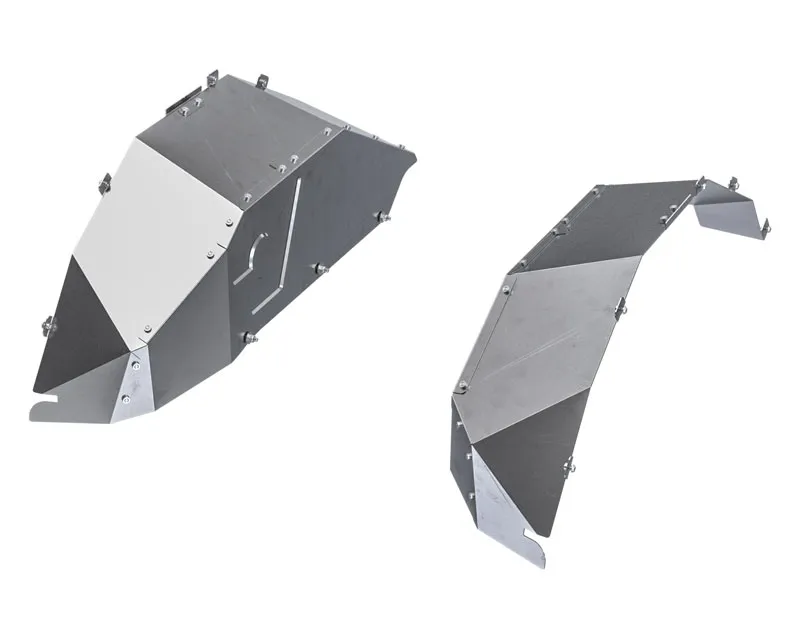 - Includes Passenger and Driver side inner fenders Allows use of larger tires Four piece construction per side for lower cost of shipping Pressed PEM nuts on seam between pieces for easy installation Shipped bare unfinished aluminum for decreased cost and ability for you to paint or powdercoat to fit your style Note: While all precautions are made to ensure the aluminum surface is protected, small scratches from either the raw material from the factory, the manufacturing process, or the shipping process may be present in this unfinished product. We recommend you finish this product with either painting, powdercoating or another similar process and prepare the surface prior to finishing as you would normally to remove any minor blemishes. Mounts to OEM holes on sub frame plus additional holes to be drilled. See instructions for hole locations to determine if modification will be necessary to install with aftermarket fenders. While aluminum is corrosion resistant, it is recommended to have some type of coating for long term corrosion protection.