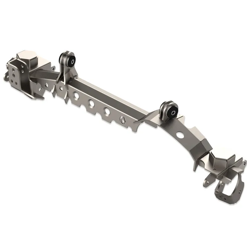 JL 1 Ton APEX Front Superduty Swap Kit 2005-Present With Daystar Bushings Patent Pending APEX Truss peaked top design provides more rigidity than a flat top truss design CNC Precision Laser cut in-house from 1/4 inch and 3/16 inch mild steel for a lightweight yet strong solution...starting at only 30 lbs total CNC Precision Bent in-house for a great fitment. Literally drop the truss in place on the axle and it's ready to weld. No puzzle piece assembling Designed used 3D models directly from Ford, Jeep and In-house 3D scanning for not only an amazing fit but clearances with surrounding components 70 percent less welding needed than previous truss designs means less warping, faster turnaround, and lower costs All long seams are bent so you don't need to spend time welding them together Dimpled holes provide not only weight reduction but rigidity and strength Contours both the cast steel differential and can be welded with normal MIG welder and moderate pre-heating and post-heating OEM location Upper Control Arms mount to an ultra high clearance Differential Bridge that hugs the shape of the casting (bushing or Johnny Joint option) Truss extends under coil buckets all the way to inner C for end-to-end rigidity Multi-piece truss design means smaller packaging and less shipping costs along with easy installation Using a 1 ton axle will support larger tires and less chance of breakage in extreme conditions Coil brackets and bump stop pads are combined to form an axle tube truss and allows for easy installment of other brackets Includes all the brackets necessary for a complete axle swap including upper and lower control arm mounts, shock mounts, anti-sway bar mounts, trackbar mount, bumpstop pads and coil spring mounts. Heavy duty Trackbar bracket can slide to multiple positions for steering geometry fine tuning Shock brackets have been moved up and out (compared JK OEM position) for a slightly higher clearance for lower control arms and frame Overall low profile design means your axle is stronger, sleeker, easier to fit into any vehicle, and less likely to interfere with vehicle components Important Notes: The Front 60 that works with this kit is from Ford F-250 and F-350 trucks from model years 2005 and up (coil spring). This truss is not intended for newer axles due to different differential offsets. Trimming of the factory differential casting may be necessary (see instructions). Other fabrication and modifications may be needed due to variances in lift kits and other factors. Removal of passenger side leaf spring perch is necessary. Due to the larger casting on the 60 differential, the Lower Control Arm (LCA) brackets are wider than factory location (41.5 inch Center to Center). Modifications to your Lower Control Arms will likely be necessary. If you have adjustable arms with flexible style joints (heims, Johnny Joints, etc), modifications may not be necessary. Upper Control Arm (UCA) brackets are also slightly higher than factory so adjustable arms may be necessary. The shock mounts are also slightly higher (1.25 inch) than stock to clear the lower control arms. This kit does not include any parts for ABS sensors. It is only a bracket kit. Hooking up and configuring these sensors is the responsibility of the end user. 60 axles Do Not Match the factory JK 5 lug wheel bolt pattern. New wheels will need to be purchased to do this swap. Brake and Steering components Not Included in this product, but will be available soon. This will likely require bumpstop extensions and a new trackbar since the steering is different on this axle from factory axle. The trackbar bracket is higher than stock location to allow proper steering geometry.