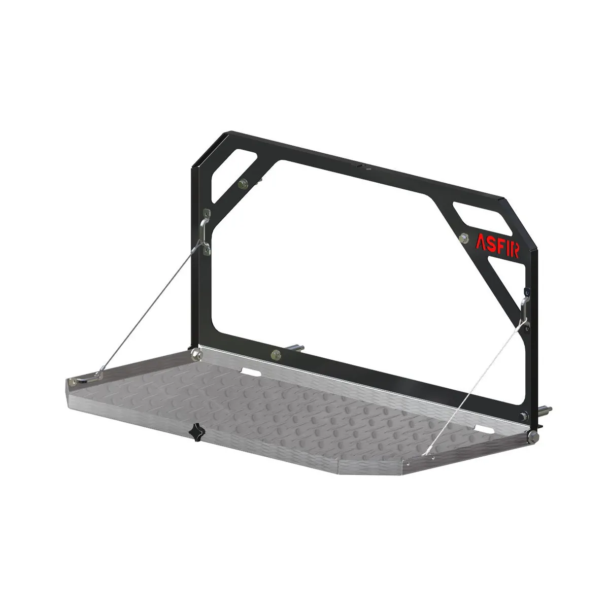 Asfir developed a folding shelf that connects comfortably and efficiently to the back door of the vehicle so that you will never be left without a place to put a drink.