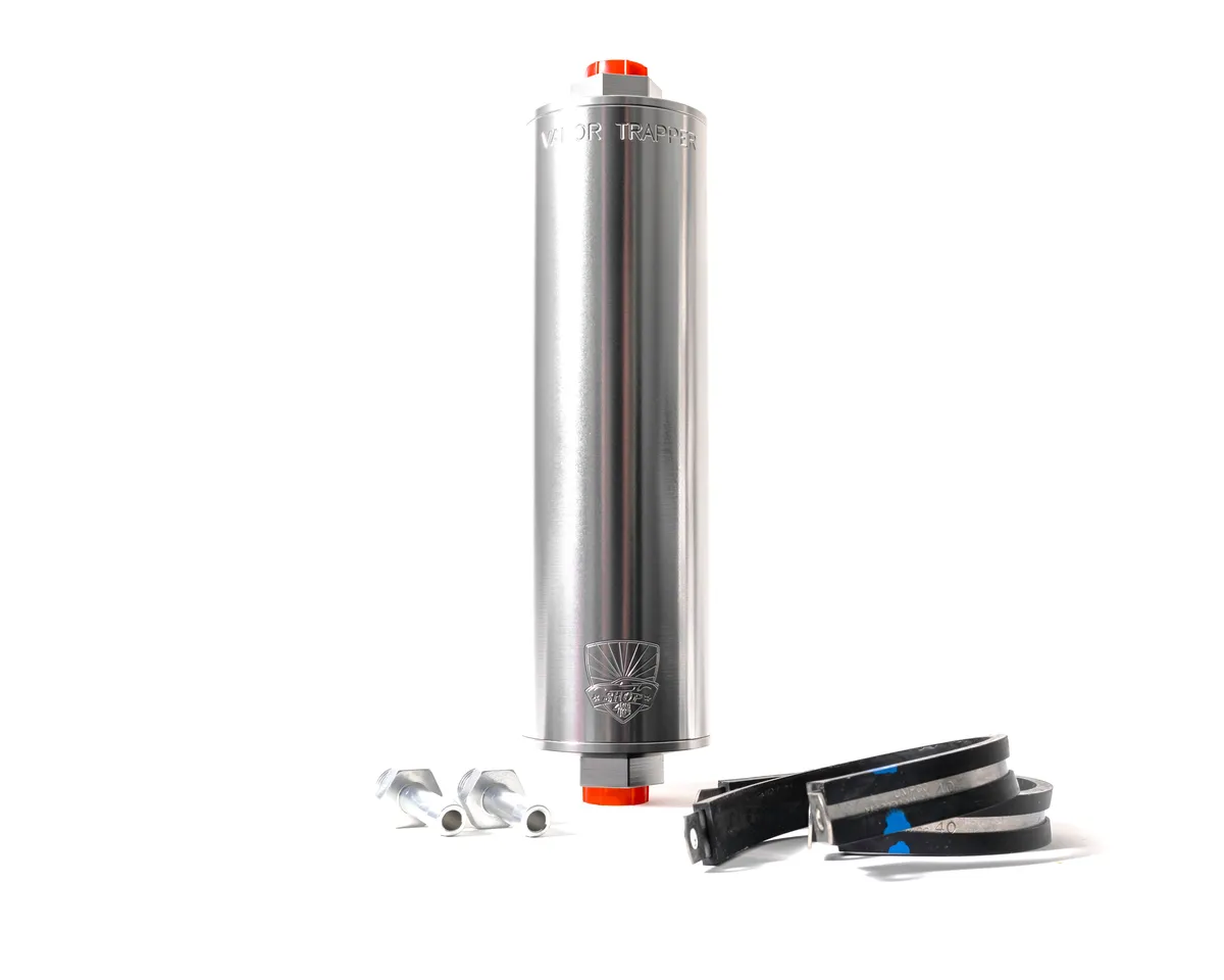 Charcoal Canister - Shop48 Vapor Trapper - 8 in Long - 6 AN Female O-Ring Inlet - 6 AN Female O-Ring Outlet - Fittings / Mounting Bracket Included - Aluminum - Silver Anodized - Kit