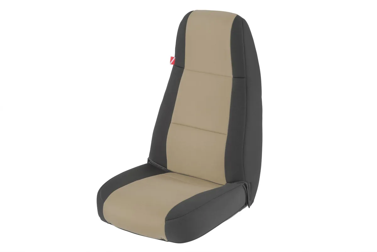 Jeep Wrangler Neoprene Seat Covers for 1991 Jeep Wrangler YJ Tan Diver Down. It's like having custom made wet-suits for your Wrangler seats! Protect upholstery from water, dirt, grime and normal wear and tear while adding a customized look. Diver Down seat covers make an excellent choice for Jeepers with active lifestyles. Our custom fit seat cover kits are cut and patterned to each specific vehicle providing an exact fit like the original upholstery. Seat covers feature black neoprene backs and sides with your choice of seven great inner panel colors to provide the ultimate interior makeover. The genuine neoprene material provides lasting durability with a soft cushioned feel. Our neoprene seat cover material has an excellent thermal resistance that stays cool to the touch on hot days yet warmer during the colder months. Diver Down seat covers retain all seat functions with provisions for side airbags if equipped.