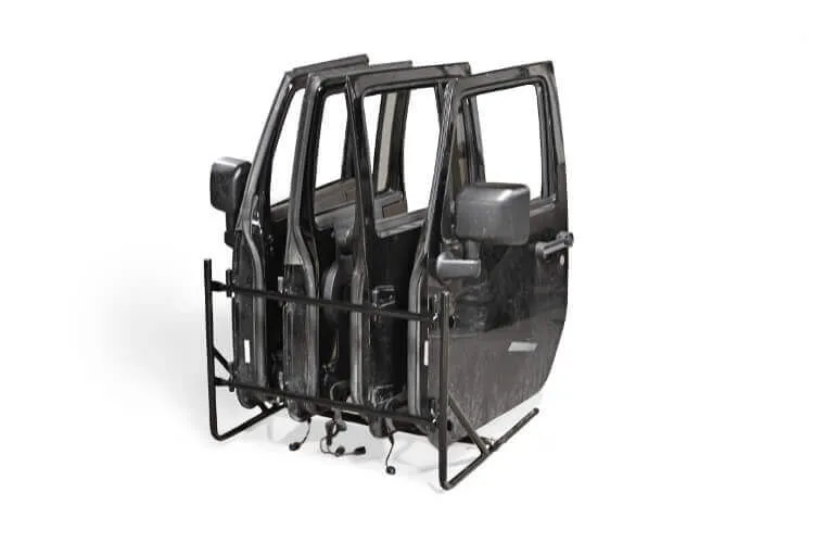 Jeep Gladiator JT Doors 2019 to Present Free Standing Holders Make: Jeep Model: Gladiator JT The Steinjäger portable door holder is easily disassembled and reassembled with the use of six wing nuts. Both stock doors or tube doors are fully supported by the door hanger. Taking up only about 1.25 cubic feet of space, carrying this door hanger with you to an event is very simple. Since the doors are used in the structure of the tube holder, it is normal to have some side to side movement when the hanger is empty. We have included an alignment pin to ease putting the first door in the rack.