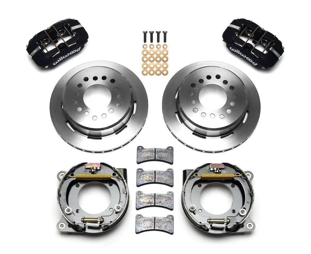 Forged Dynapro Low-Profile Pro-Series rear disc brake kits provide a complete solution for popular muscle car rear axles on applications that require a parking brake assembly and extra clearance for 14.00” to 15.00” rim applications. Forged billet Dynapro Low-Profile four-piston calipers 11.00” one-piece hat and rotor assemblies, and high friction pads provide optimized and balanced braking for all types of custom performance street/strip and show machines. The neatly hidden internal shoe system provides a clean installation with superior static holding power for parking. Optional caliper finishes and rotor designs enable the builder to personalize the style and optimize brake performance for every individual application.