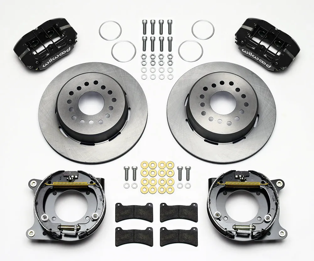 Forged Dynapro Low-Profile Pro-Series rear disc brake kits provide a complete solution for popular muscle car rear axles on applications that require a parking brake assembly and extra clearance for 14.00” to 15.00” rim applications. Forged billet Dynapro Low-Profile four-piston calipers 11.00” one-piece hat and rotor assemblies, and high friction pads provide optimized and balanced braking for all types of custom performance street/strip and show machines. The neatly hidden internal shoe system provides a clean installation with superior static holding power for parking. Optional caliper finishes and rotor designs enable the builder to personalize the style and optimize brake performance for every individual application.