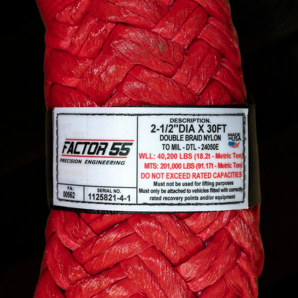 Factor 55 double braided nylon recovery rope can stretch up to 30 percent of its total length. It also features a flexible, durable, weather-resistant polymeric coating for extreme durability, and rubberized rope eyes for maximum durability at the wear points of the rope. Size: 2-1/2 inch diameter