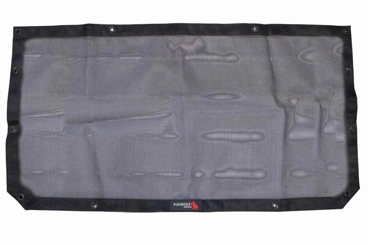 Fits 2018-2023 Jeep Wrangler JL Fits 2018-2023 Jeep Wrangler Unlimited JLU Fits 2020-2023 Jeep Gladiator JT Fits hard and soft top models, and sound bar options. Made from durable and resistant Nylon Mesh Fits tightly into the center of the bungee points. Allows light storage on top when soft or hard top is installed. Made in the U.S.A. Enhance your driving experience with the Fishbone Offroad Front Sun Shade. Designed to accommodate both hard and soft top models, this sun shade also caters to various sound bar options, making it a versatile and valuable addition to your Jeep. Constructed from durable and resistant Nylon Mesh, the Front Sun Shade fits securely within the roll bars, providing a cooling cover that shields you and your passenger from the sun's intense rays. This versatile accessory comes with 21 bungee cords, allowing you to adjust the tightness to your preference, ensuring a perfect fit and the ideal head height. With your soft or hard top installed, this shade permits convenient storage of light items on top, enhancing your overall Jeep experience. Manufactured in the U.S.A., Fishbone Offroad delivers a high-quality solution for sun protection and style, enabling you to enjoy every ride with added comfort and functionality. Installation Instructions Downloadable PDF
