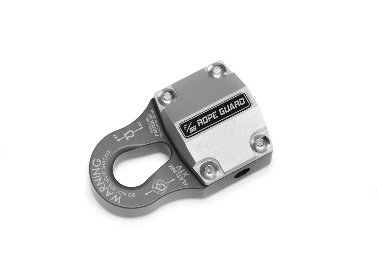 - We recommend that the FlatLink first be removed from your winch line prior to the Rope Guard installation. Then, remove all rubber pieces from your FlatLink. A little prying from a flat blade screwdriver should do the trick in popping out the rubber barbs. You will need to reinstall two of the rubber pieces after the Rope Guard installation is completed. We recommend that you place the FlatLink on top of a piece of wood on the ground or workbench surface prior to hammering in the drive rivets. Be sure to orient the Rope Guard in the correct direction (slot facing the rear) prior to proceeding with the rivet installation. Now simply insert the 4 included drive rivets and using a ¼ inch punch, hammer the drive rivet posts down until the posts are flush with the top of the rivet head. Reinstall the rubber pads (lubricate the barbs) on the opposing side and you are done. Video Specifications Compatibility Factor 55 Flatlink XXL Shackle Mounts