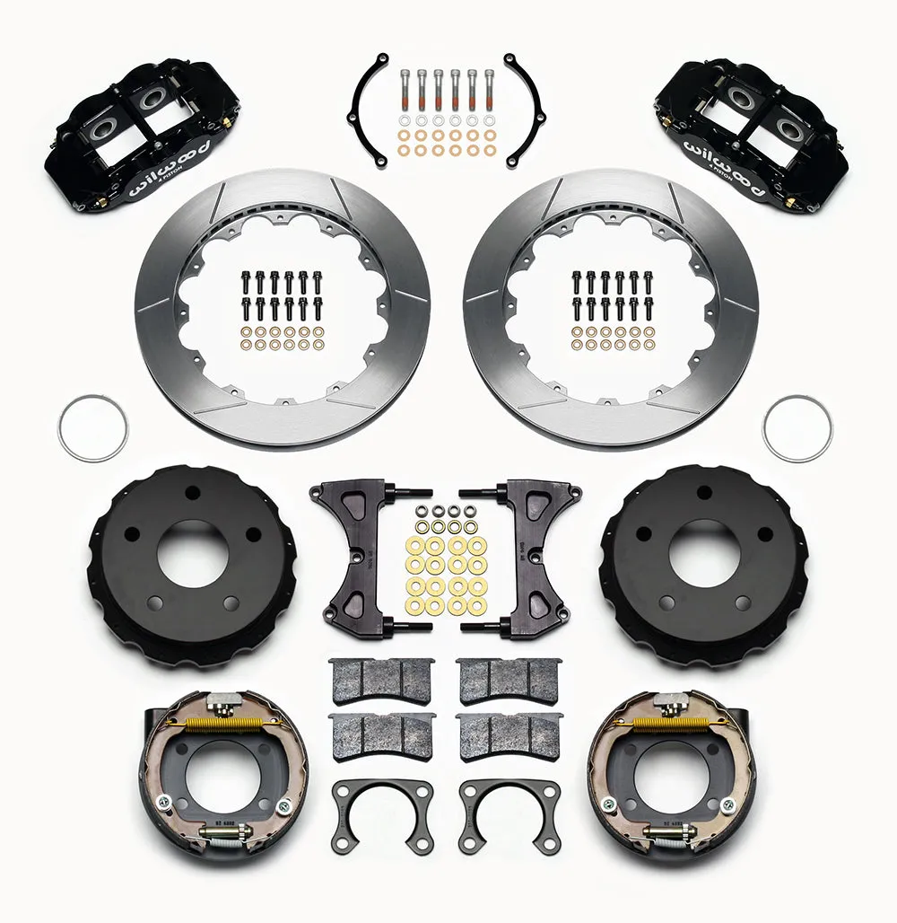 These versions of Forged Narrow Superlite 4R rear disc kits provide the ultimate Big Brake solution for Bronco 65-77 rear axles with Big Ford flange and bearing. (normally: OE 11 inch diameter brakes and 3300 GVW.) Each includes a high efficiency drum style parking brake assembly. FNSL4R four piston calipers, 13” or 14” two-piece rotors, and high performance BP-10 compound pads provide optimized and balanced braking to compliment front big brake upgrades available for Bronco platform. The neatly hidden internal shoe system provides a clean installation with superior static holding power for parking. Optional caliper finishes and rotor designs allow builders to personalize the style and performance for every application.