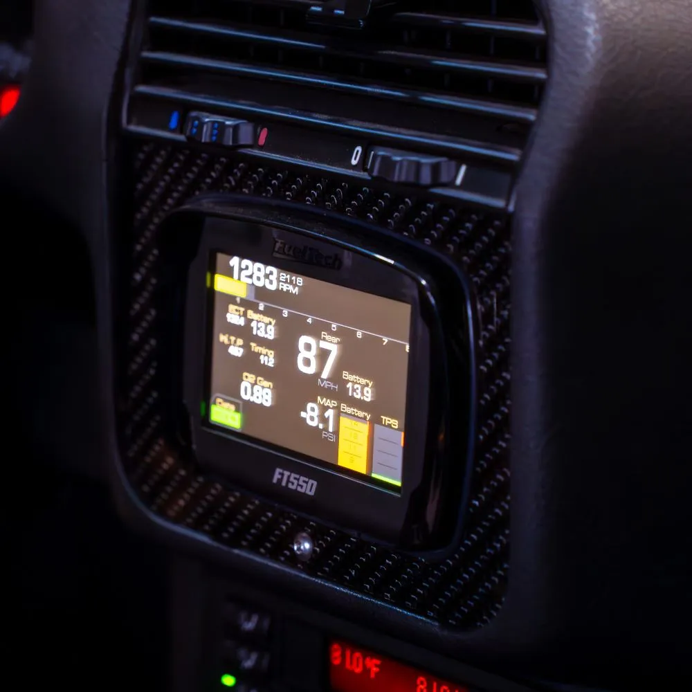 Seamlessly integrate your FT450 or FT550 aftermarket ECU into your dash with FuelTech's Dashboard ECU Inset Panel. Give a finished look to your installation by trimming the dashboard insert to fit your racecar's dash. The panel allows your engine management system to remain securely mounted in even the most demanding environments. Carbon fiber decal not included.