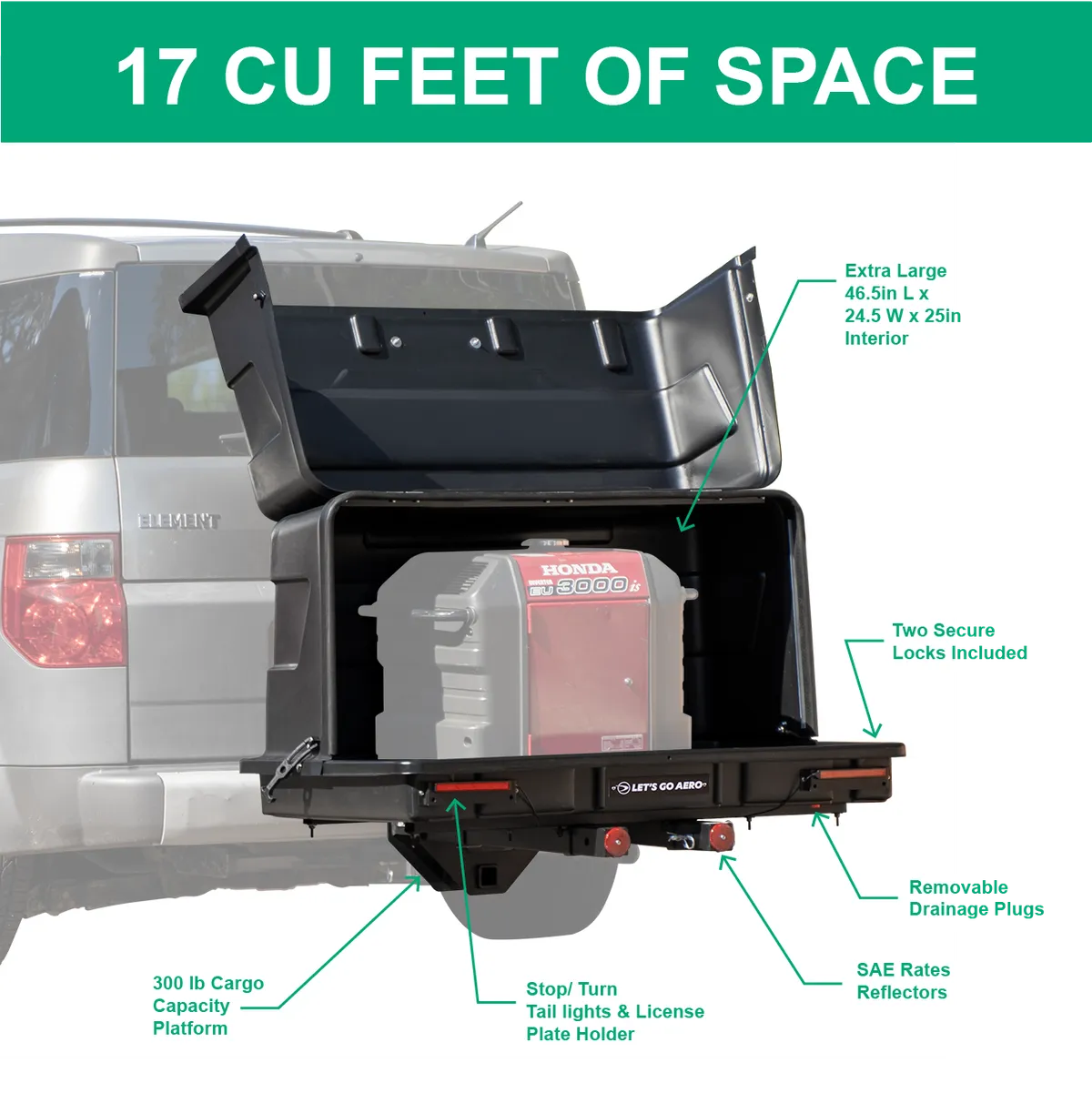 Let’s Go Aero GearDeck® slideout enclosed hitch mounted carrier provides a generous 17 cubic foot capacity for hauling both travel cargo and utility equipment including generators popular on RV towables, truck campers, and mid-sized vehicles. The slide-out feature clears SUV hatches, tailgates, Sprinter RV and other van doors with a strong and stable dual-tube frame design for demanding off road terrains and RV trailer tow environments.