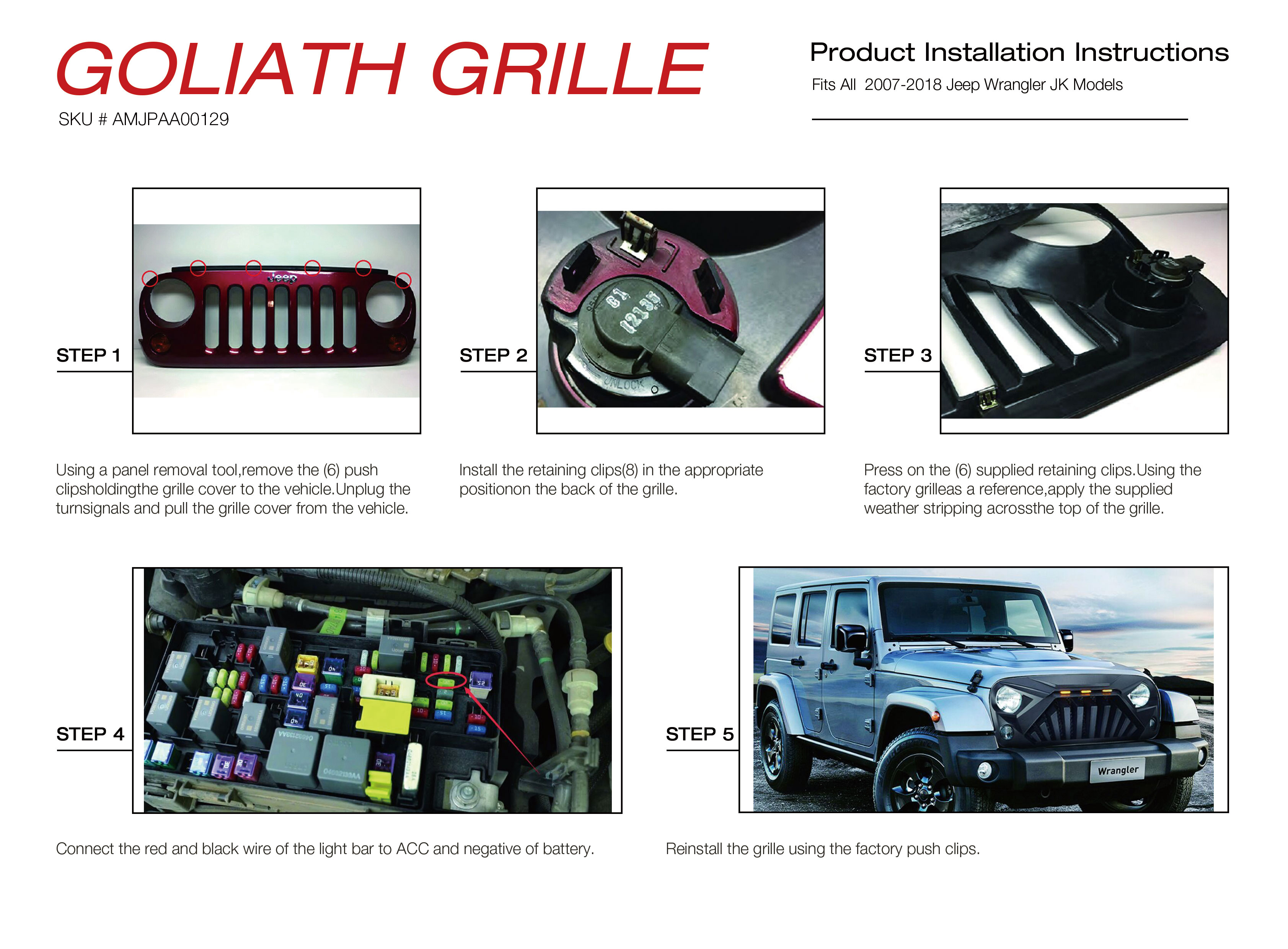 Product Specification Part# AMJPAA00129 Package Dimensions: 49.8*18.9*5.91 inch Package Weight: 10.8 Ibs Features Give Your Wrangler A New Wild Look Amber Running Lights Aggressive Off-Road Styling Glossy Black Finish Durable ABS Plastic Construction Simple Installation Fits All 07-18 Jeep Wrangler JK Models Descriptions Give Your Wrangler A New Wild Look: Compatible with 07-18 Jeep Wrangler JK Models, replacing your old style grill with the awesome "Goliath" grill inspired by angry eyes design, your off-road vehicle will become the center of attraction and attention while you drive it on the road.