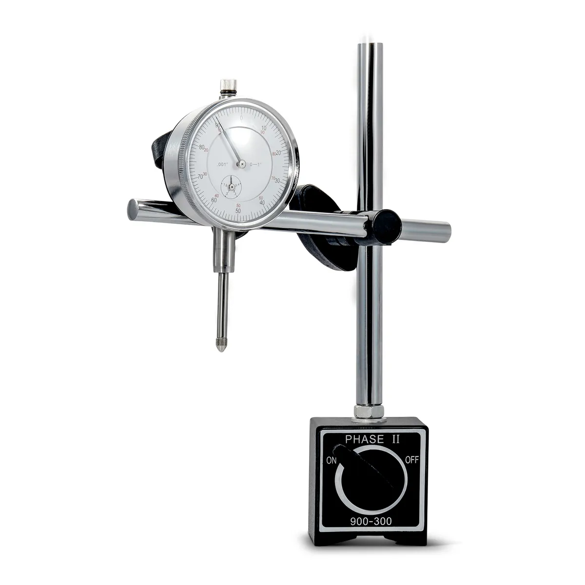 No more fumbling with a magnetic base and a dial indicator to measure cam lift. This fixture attaches to a 1/4-20 inch valve cover bolt hole and holds the dial indicator in the precisely correct position over the rocker arm or valve retainer, assuring proper geometry. Includes 0-1.000 inch Dial