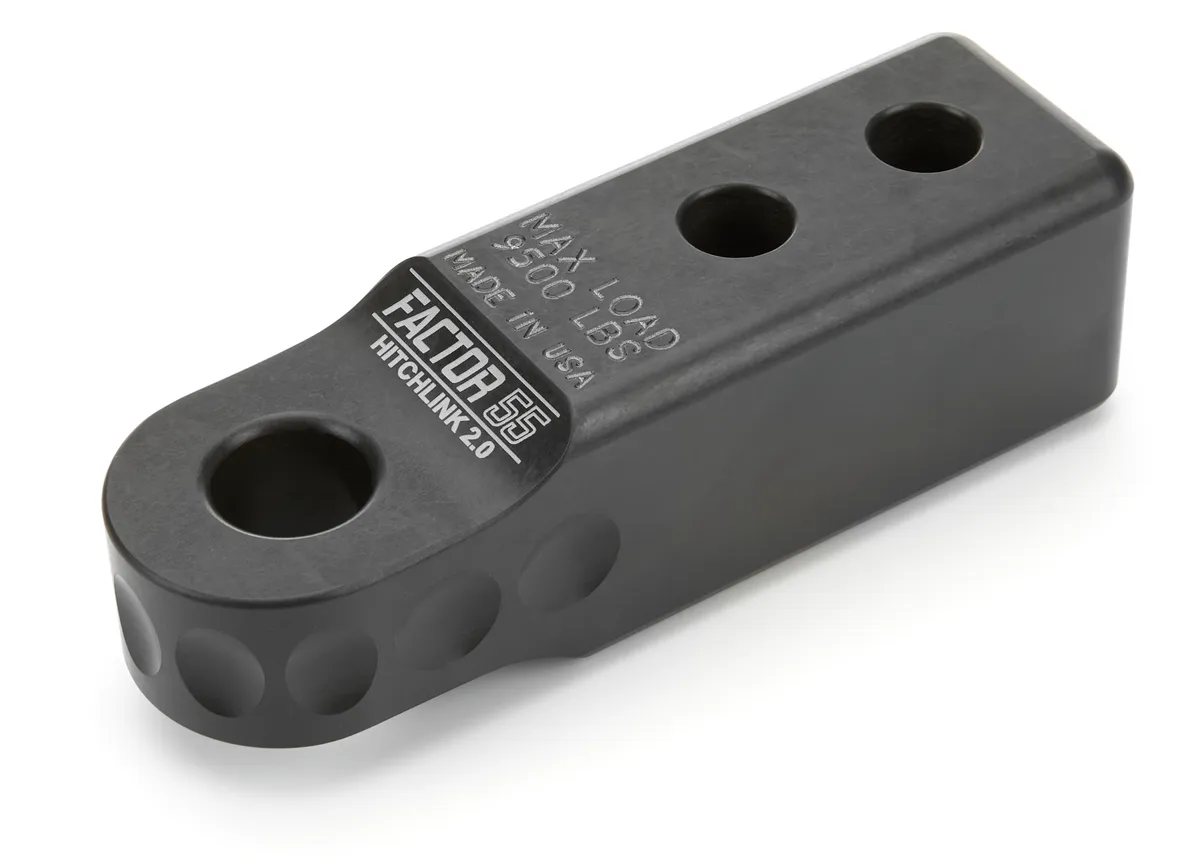 Description Easily convert your vehicle’s hitch receiver into a recovery point. Hitchlink 2.0, for 2" receivers Slide it into the receiver, secure it with a pin, and you’re ready to pull Made from lightweight, super-strong CNCmachined 6000 series aluminum Simply slide the shackle mount into receiver opening and secure with hitch pin (not included) Machined radius on shackle mount hole for soft shackle compatibility Lightweight precision CNC machined 6000 series aluminum Weighs only 1.9 pounds. Steel versions weigh up to 8 pounds Rated at 9500 pounds Ultimate failure at 51,000 pounds Fits common ¾ screw pin shackles/D-Rings Machined radius on shackle mount hole for soft shackle compatibility Anodized or powder coated for oxidation protection Overall size- 6.6″ x 2″ x 2″ Engineered, tested, and made in USA Check out the Factor 55 Truck/SUV Catalog WARNING: Never exceed factory receiver hitch pull rating Always use a quality steel alloy 5/8” hitch pin Always pull in line with the hitch, do not bind or side load the shackle Video