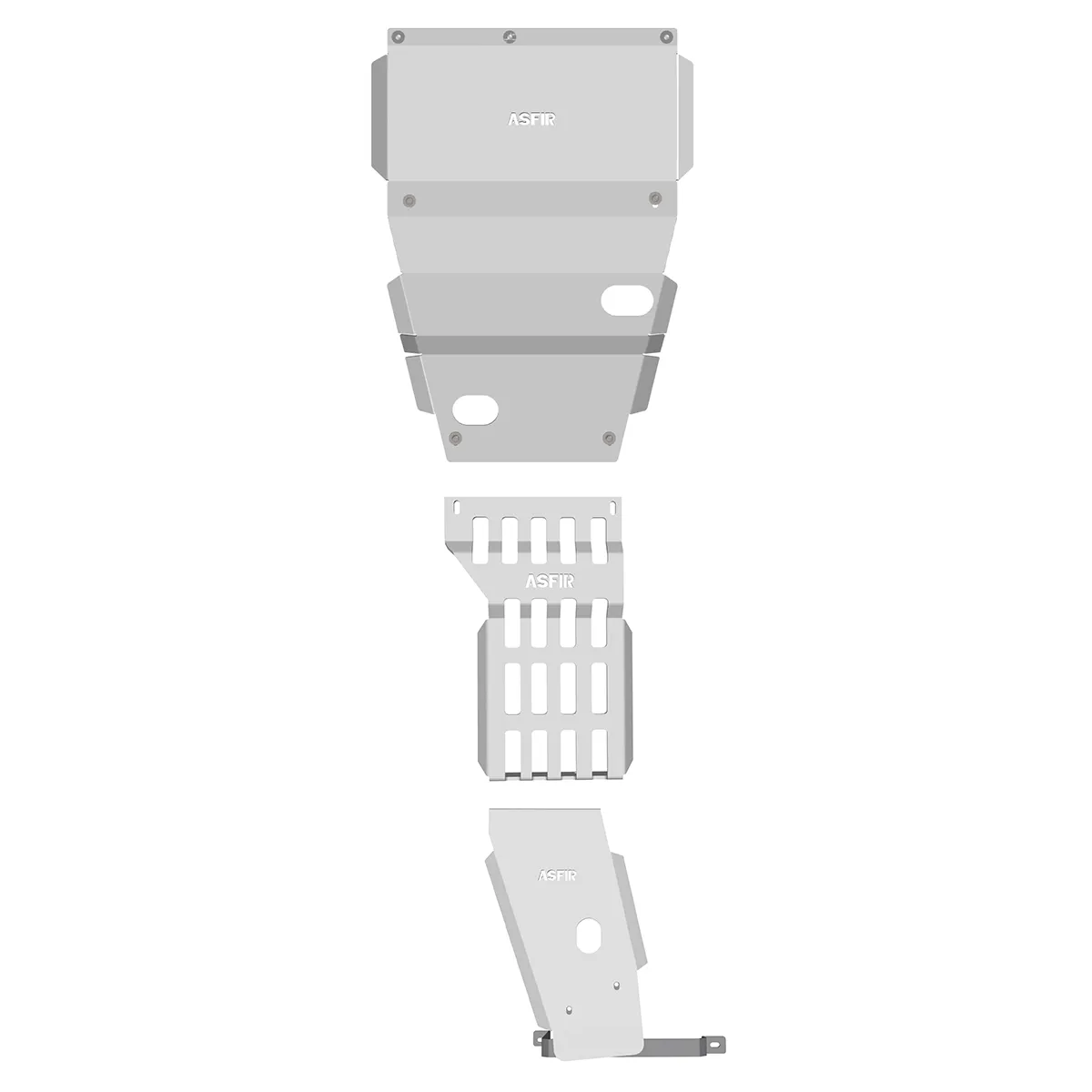 transmission, transfer case, and front. Built from 1/4" (6 mm) aluminum and ~5/16" (8 mm) stainless steel. Reinforced with stiffening ribs in high-impact zones. Direct bolt-on installation with zinc-coated steel brackets for durability. Ventilation hatches and drain holes improve airflow and enable debris removal. Includes all required mounting hardware.