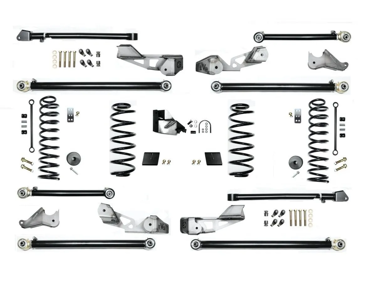 The EVO MFG 2.5 Inch JLU High Clearance Long Arm kit will lift your JLU 2.5 Inches. Through specifically designed bracketry we accomplish the ultimate in suspension and chassis clearance, larger wheel travel ability, optimal suspension geometry with increased ride quality. Clearance, ride quality, performance and ease of installation was our focus in creating this long arm suspension system. The front arms mount tucked up inside nearly flush with the bottom of the frame mounting inches above the stock front lower mounting bracket. The rear mounting locations for the long arm are on the side of the frame, above the bottom giving inches of clearance over the factory locations as well. Keeping optimal geometry while maintaining as much clearance was critical in the design of this system. In doing so, not only did we raise the rear control above the frame but we raised its mounting at the rear axle by multiple inches as well. This allows for an incredible ground clearance increase but just as importantly retaining flat and optimal control arm angles giving ideal ground clearance, smooth ride quality and long travel ability. The mounting brackets are specifically designed to require no exhaust cutting on 3.6L Jeep Wrangler JLU’s (minor grind/clearance to flange required) and have full length hard-face mounting surfaces that weld to your frame giving redundant and ample welding area and strength to their mounting. The mounting brackets align to the frame simply using existing factory holes giving complete assurance of proper locating during install. Simply bolt brackets up to frame with existing hardware and weld them in place. These kits come with a set of 2.5” Plush Ride Lift springs specific to each corner which will keep the Jeep Wrangler JLU more level side to side and will maintain a unique and compliant ride quality. EVO MFG Long Arm joints feature Johnny Joints on both ends of the control arms for restriction free articulation and motion with no wearable and limited bond rubber. All EVO MFG lower long arms are built with strength in mind. These arms are made from industry leading 2.0” x .250” wall Steel DOM Tubing. Include in these kits is front brakeline extension brackets, Rear swaybar endlinks and front and bumpstop extensions. Cutting, grinding and welding of frame brackets required. The EVO MFG 2.5” High Clearance Long Arm kits require no driveshaft or exhaust modifications (your shock choice may require this, contact manufacturer to be sure). Option of retaining factory shocks, maintaining wheel travel with use of shock extensions (part number EXT kits) or without shock extensions to allow for use of your choice of aftermarket 2/5” lift shocks. EVO3015K kits come with EVO SPEC King 2.5” Remote Reservoir shocks paired with 2.5" EVO Plush ride lift coils all 4 corners. 2.5” lift is based on increase of our 4 Door Rubicon. 4 Door Sport and Sahara Models will see slightly higher increases over stock and will match overall lift height of a Rubicon Model.