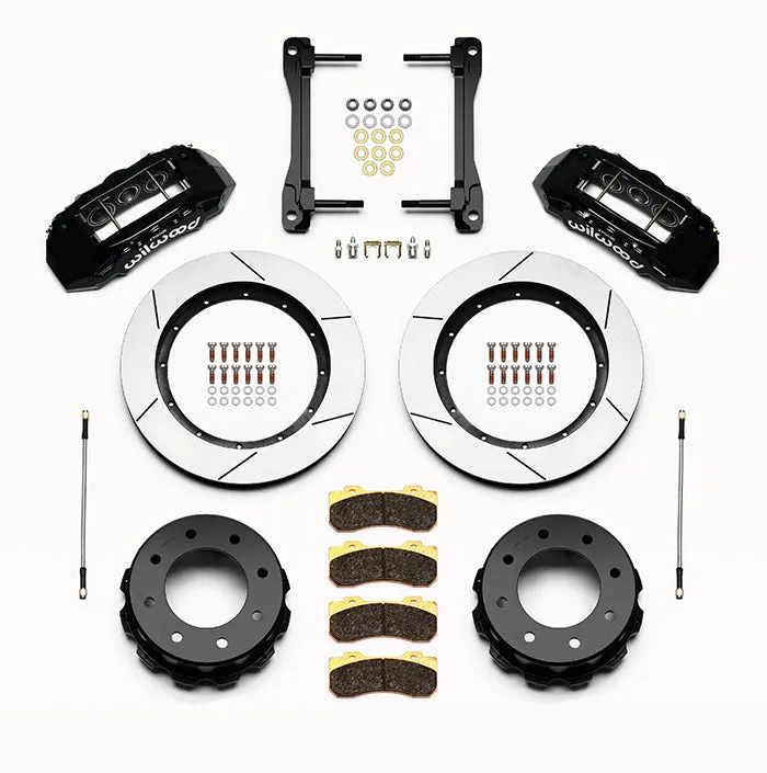 TX6R Big Brake Truck Rear Brake Kit : Wilwood’s Tactical Extreme TX6R Big Brake rear kits are ultimate in braking performance for Truck, SUV and Armored Vehicles. Using TX6R radial mount six-piston calipers and massive 15.00” to 16.00” GT-60 directional vane Spec-37 alloy rotors, these kits deliver consistent stopping power and extreme duty durability under sustained high heat with this ready to bolt-on kit. The calipers are volume matched for compatibility with original equipment power brake system output. TX6R rear kits replace the factory disc brakes and use the OE parking brake assembly as a compliment to front big brake upgrades. Kits include radial mount caliper brackets, and all the necessary hardware to complete the installation. Braided stainless steel flex lines will need to be purchased for some applications.