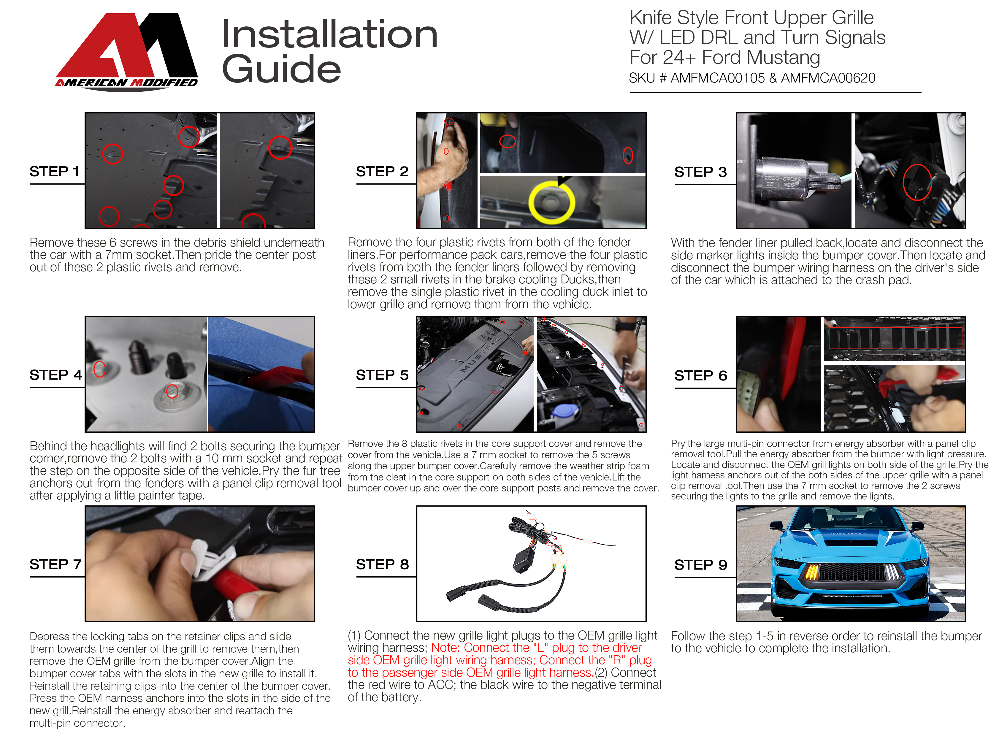 How To Wire Product Specification Part# AMFMCA00105 Package Dimensions: 51.18*14.96*7.09 inch Package Weight: 7.83 Ibs Features American Modified Unique Design Matte Black Grille W/ Bright LED DRL And Turn Signal Plug And Play Installation, Without Any Modification Fits 2024+ Ford Mustang EcoBoost & GT Descriptions Unique Design: The grill protects the body by protecting the condenser or radiator behind the grille from large stones or rocks. In addition, the shape of the grill itself is unique, and there is a bright led DRL lamp, adding a personality, practical and beautiful.