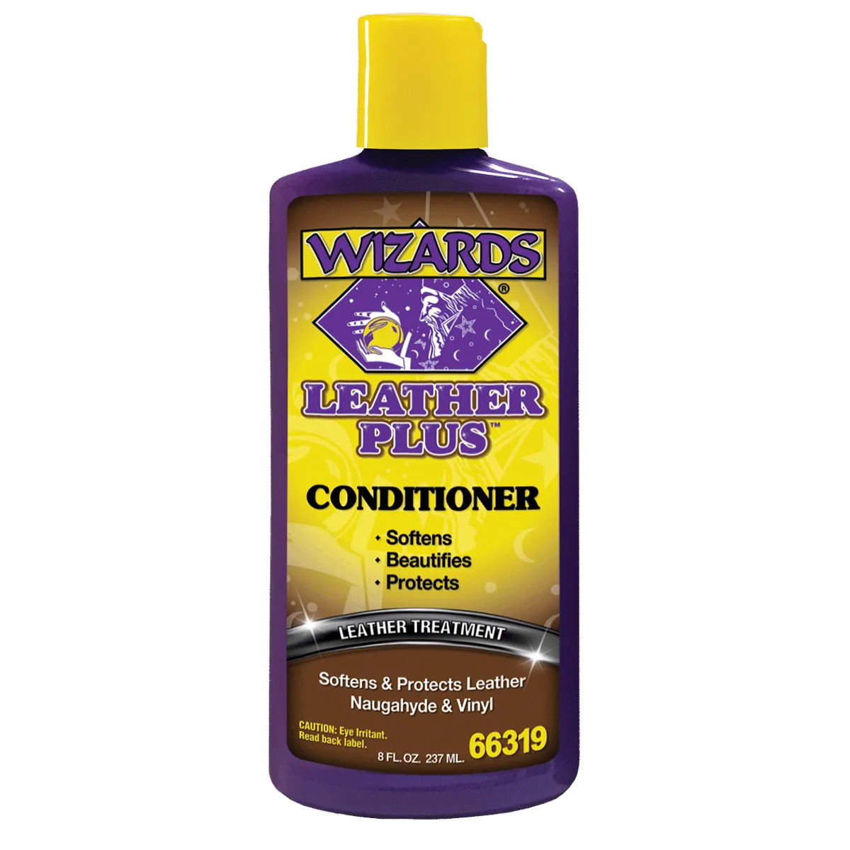 Leather Conditioner Part No. 66319, 8 oz, each or 12/Case. Preserves and protects all fine leather, naugahyde and vinyl surfaces. Contains moisturizers and lanolin oils. Concentrated cream forms a penetrating leather lotion. Use on auto, apparel, luggage and furniture. Pre-clean surfaces with Power Clean ™ #11088 WIZARDS® LEATHER PLUS™ is a conditioning cream that will nourish, preserve and enhance fine leather, naugahyde and vinyl surfaces. A gentle balance of moisturizers and natural lanolin oils are blended to form a penetrating "Leather Lotion". Use on all smooth finished leather, including: Automotive Interiors, Apparel, Luggage and Furniture.